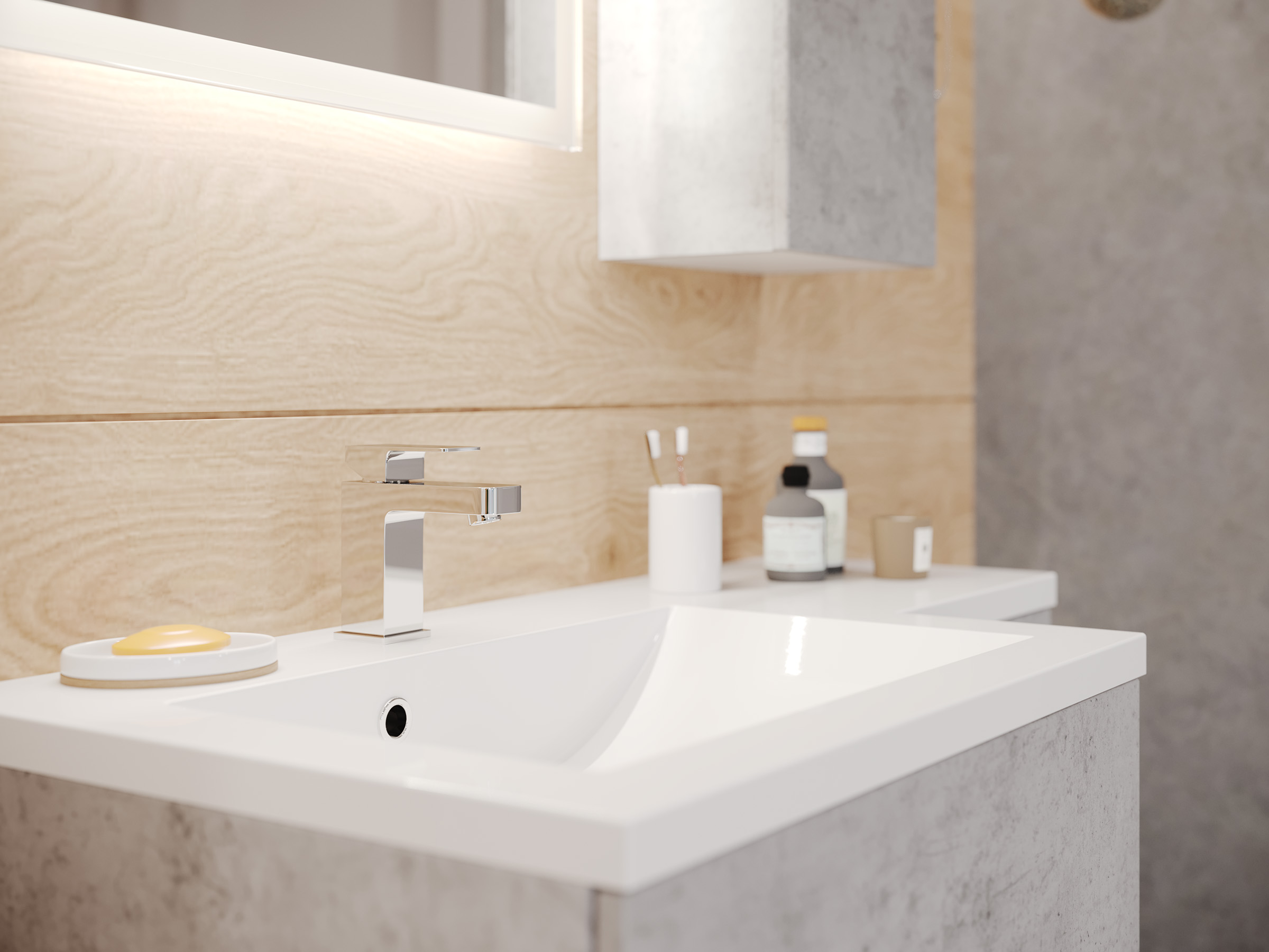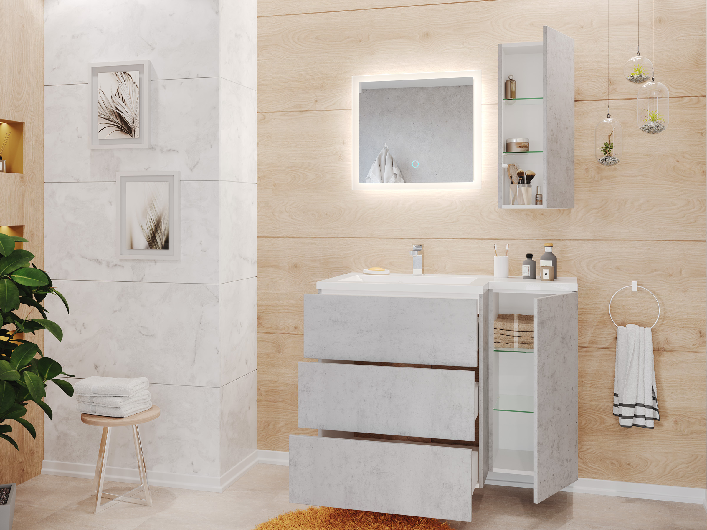 Badblock ELISA rechts 3er Set LED-Spiegel Hängeschrank beton