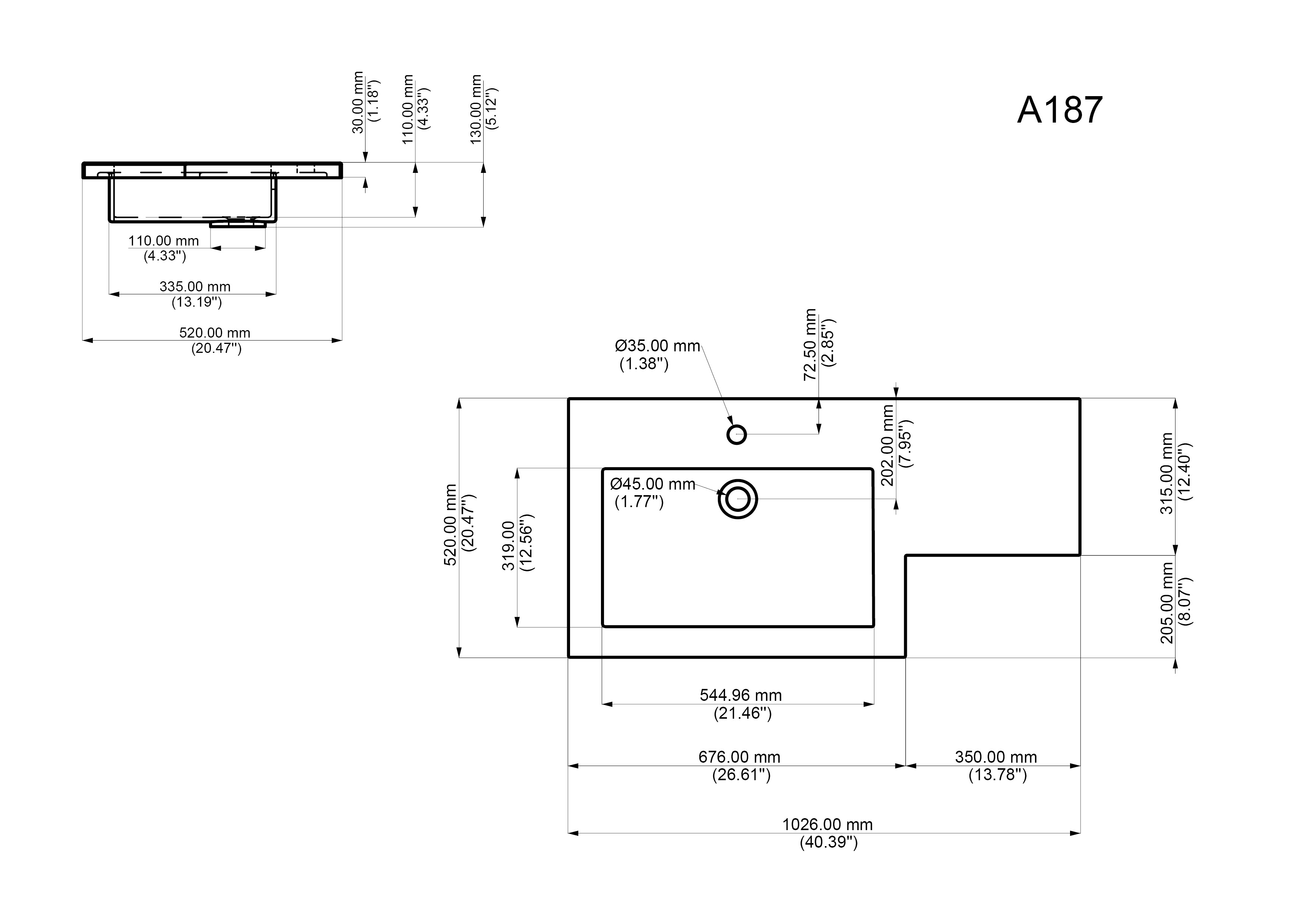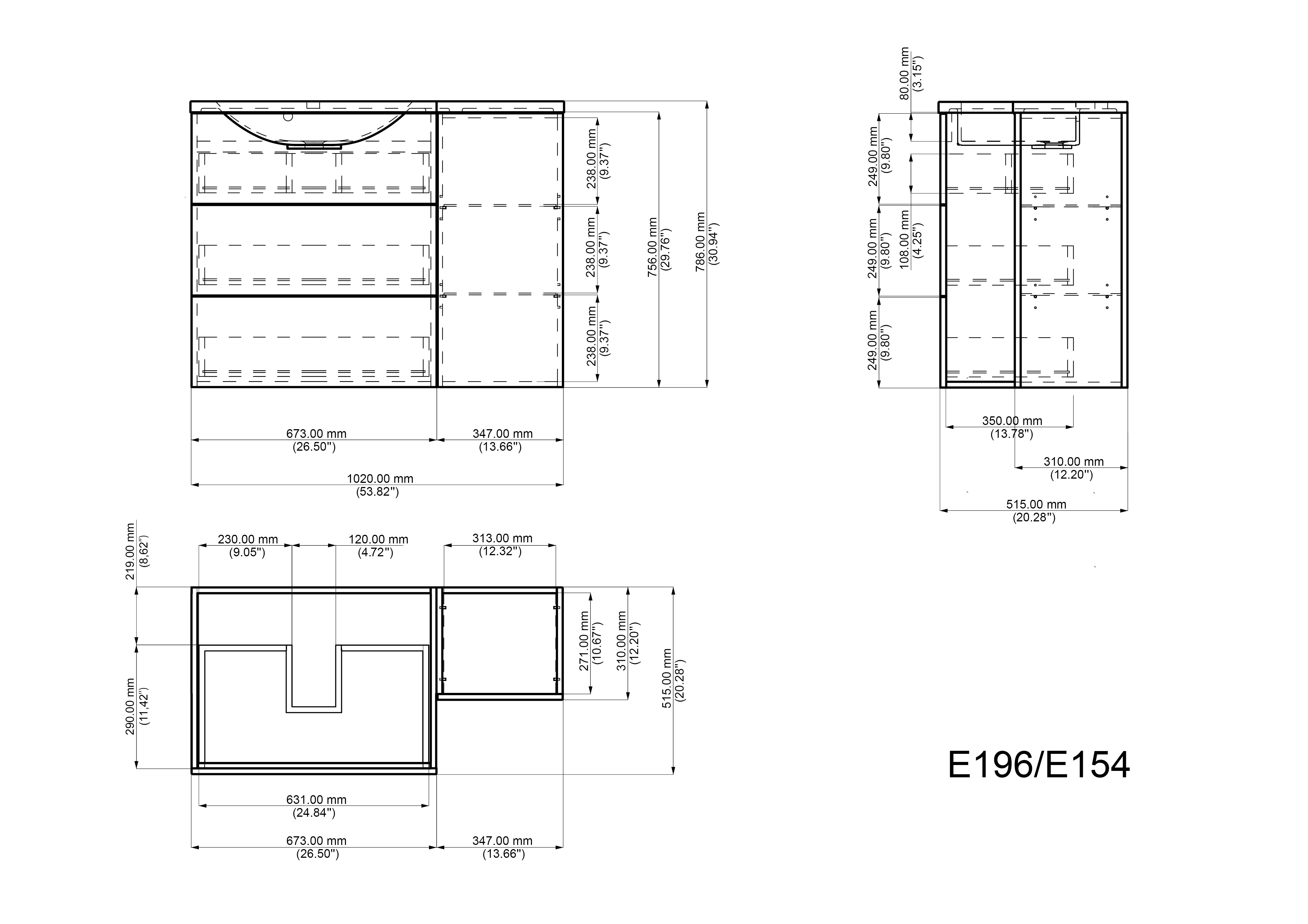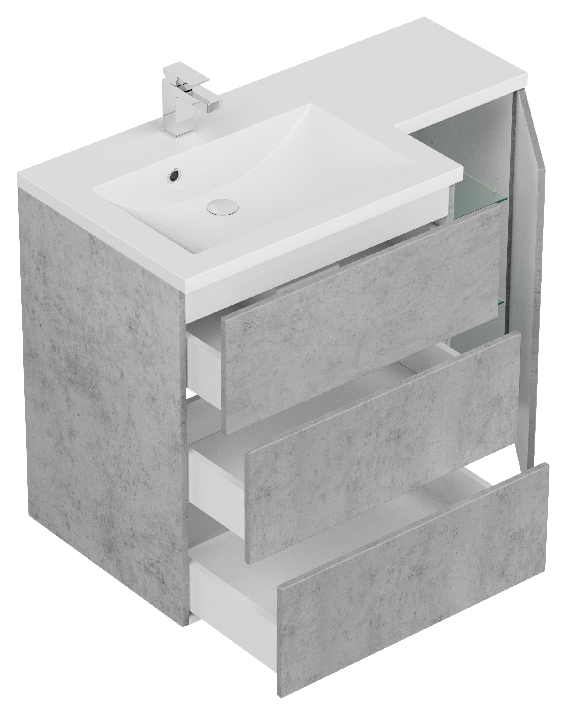 Waschtischunterschrank mit 3 Push to open Schubladen ohne Becken (B/H/T) 101,7/77,7/31-51,5 cm,Design Mineralguss-Waschbecken mit Ablagefläche (rechts!) (B/H/T) 102,6/3/31,5-52 cm.