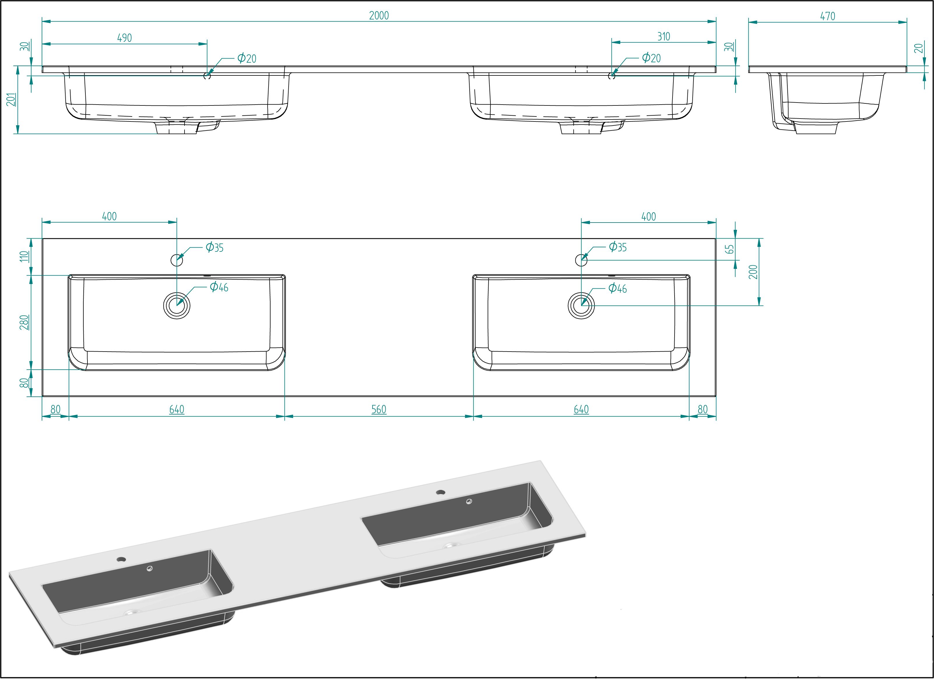 Waschtischunterschrank: (B/H/T) 198/50/46 cmWaschbecken: (B/T) 200/47 cm
