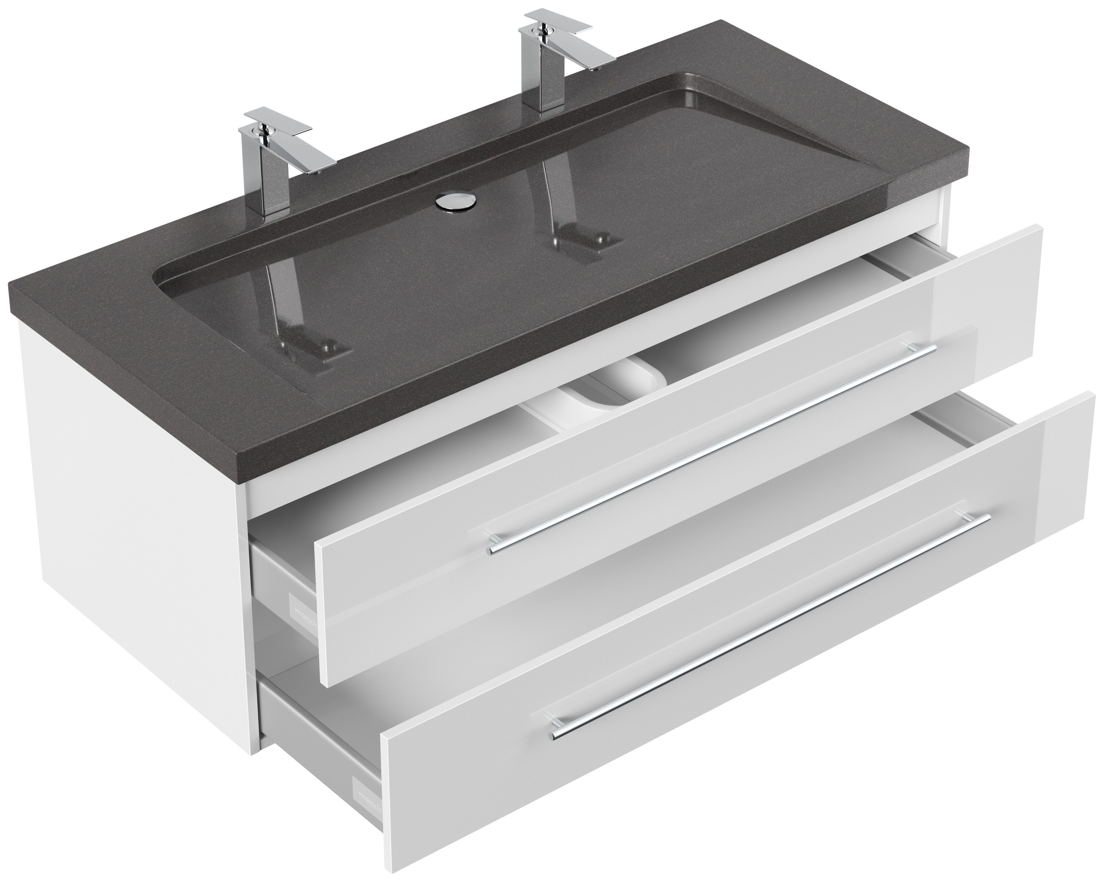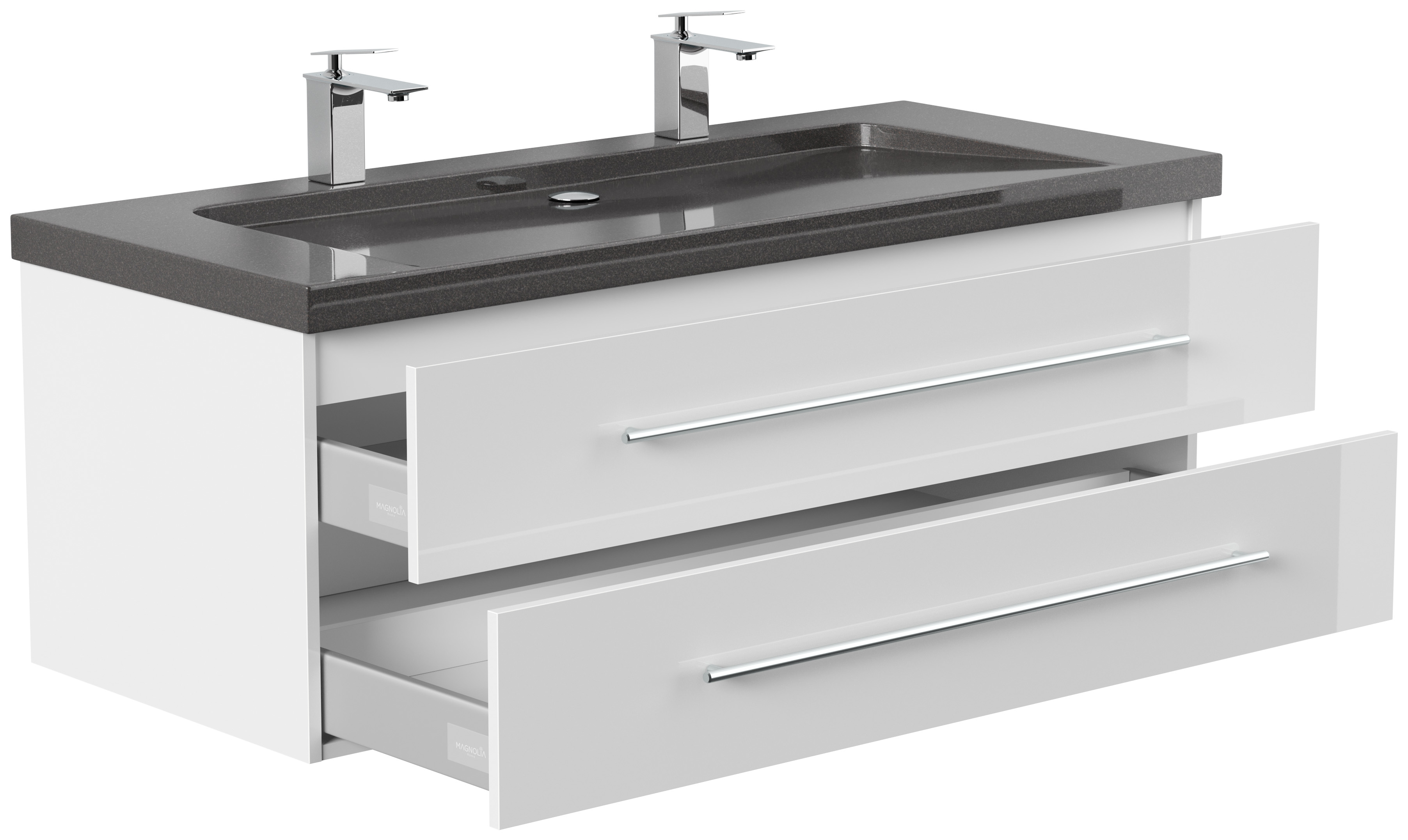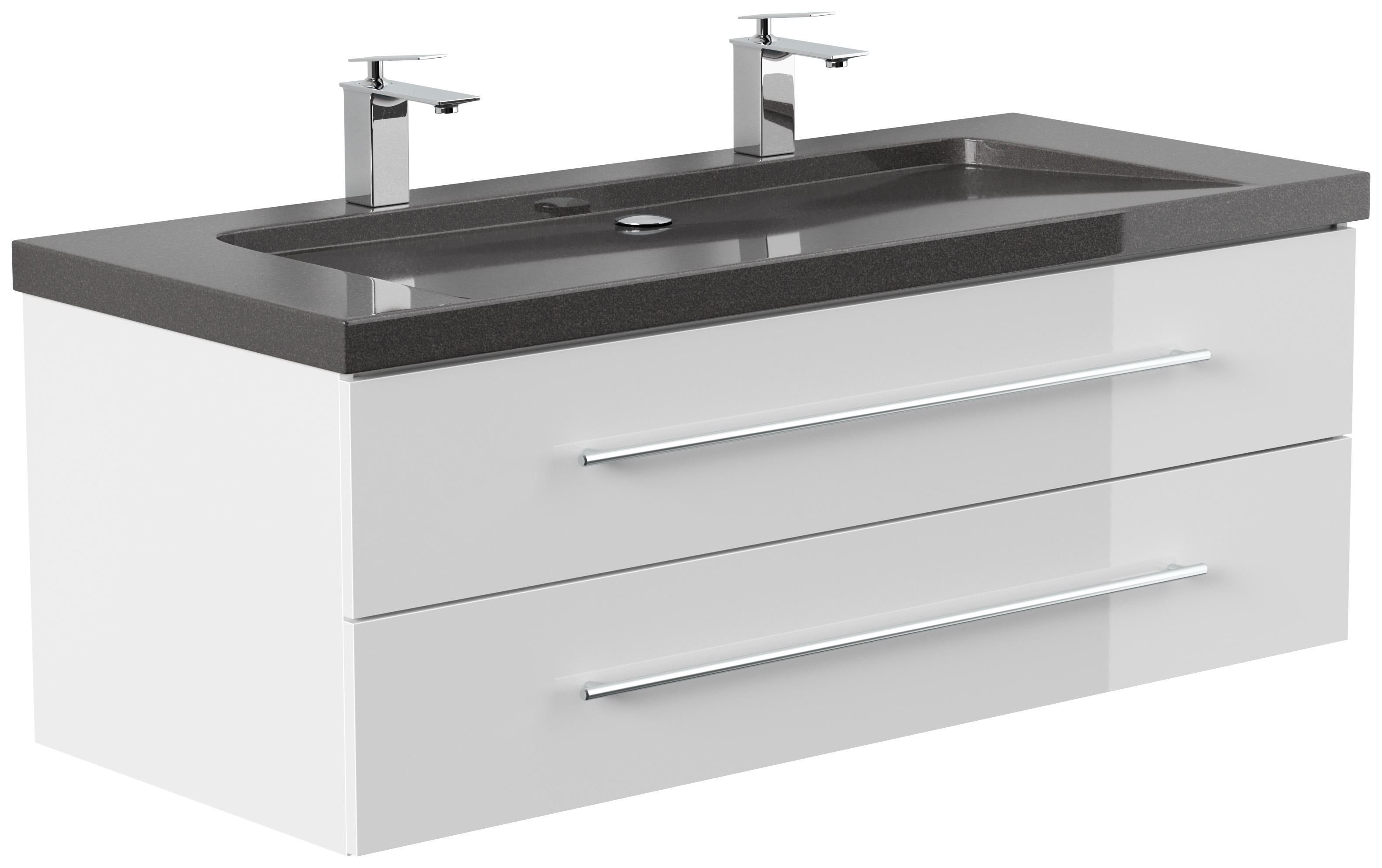 Badmöbel Granit India Black Damo 130 cm 2 Hahnlöcher SoftClose weiß hochglanz