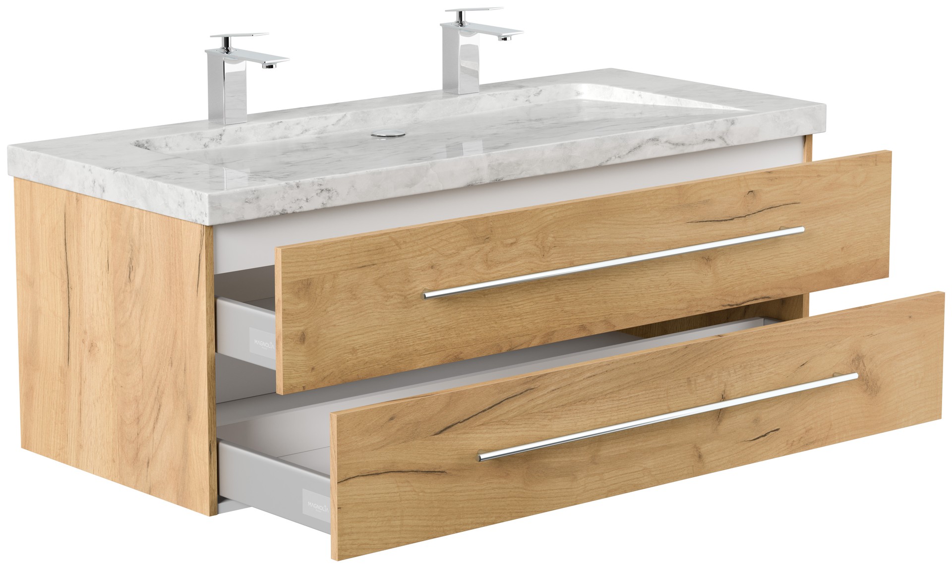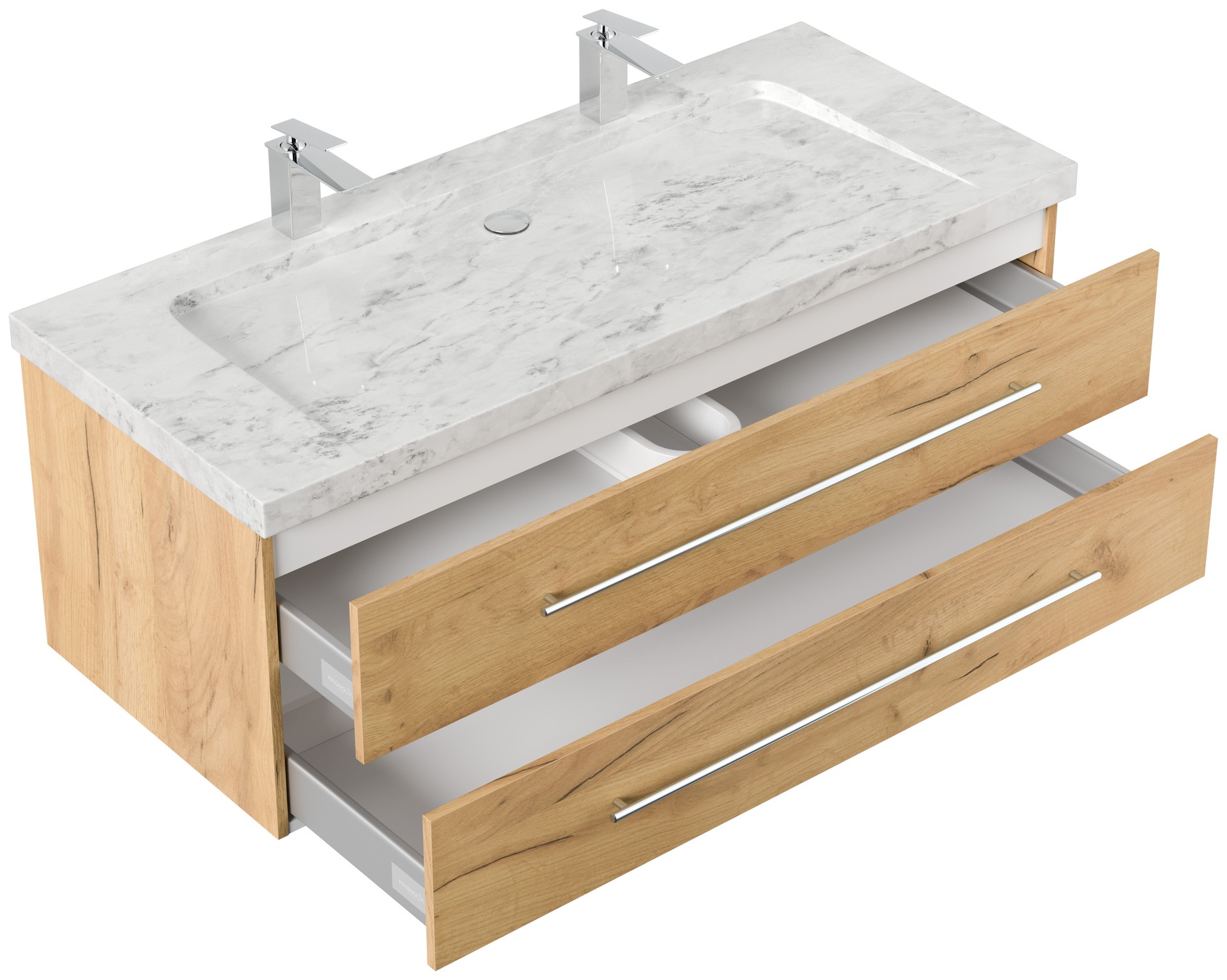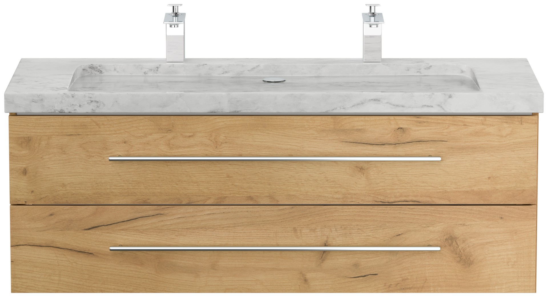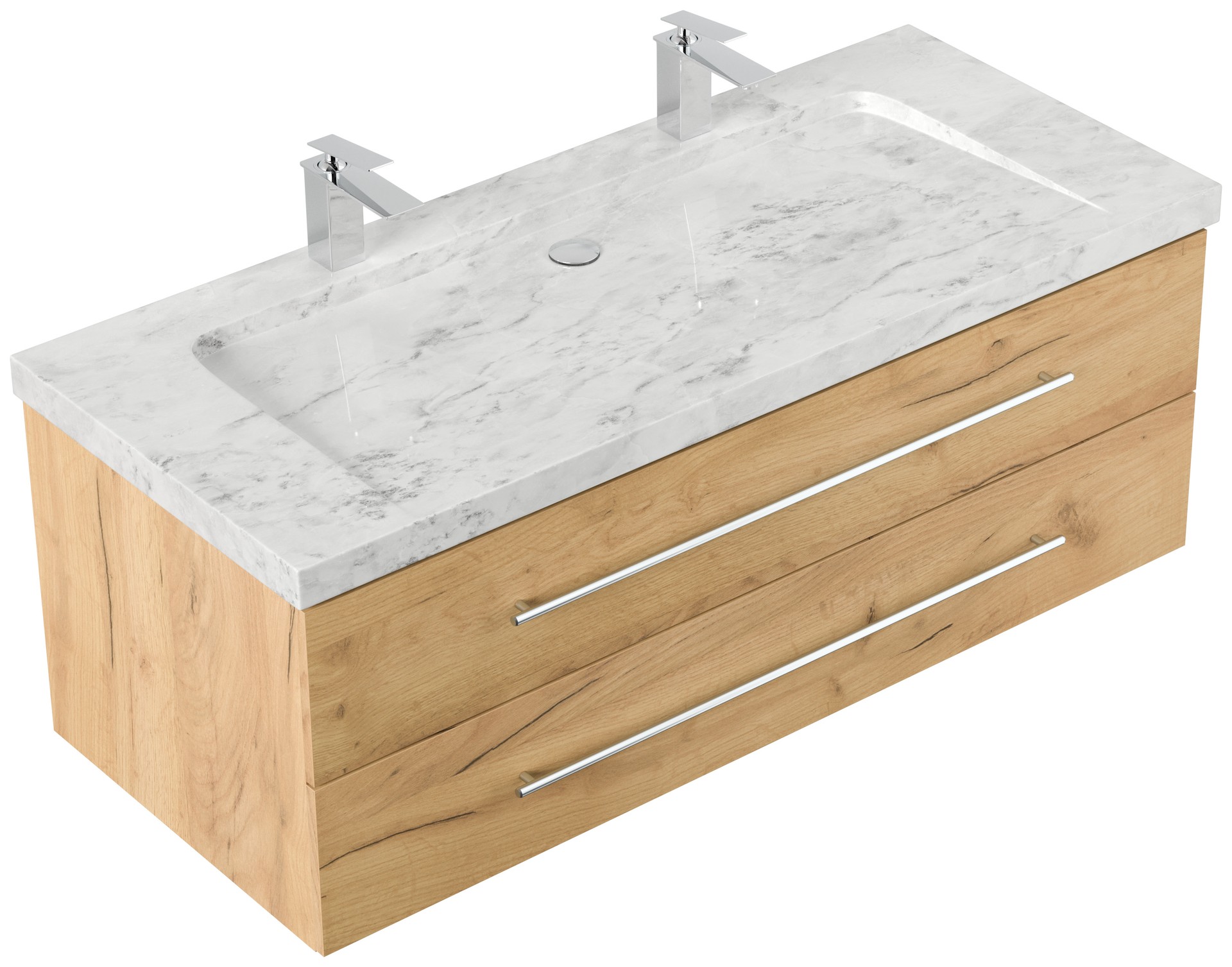 Badmöbel Marmor Carrara White Damo 130 cm 2 Hahnlöcher SoftClose eiche gold