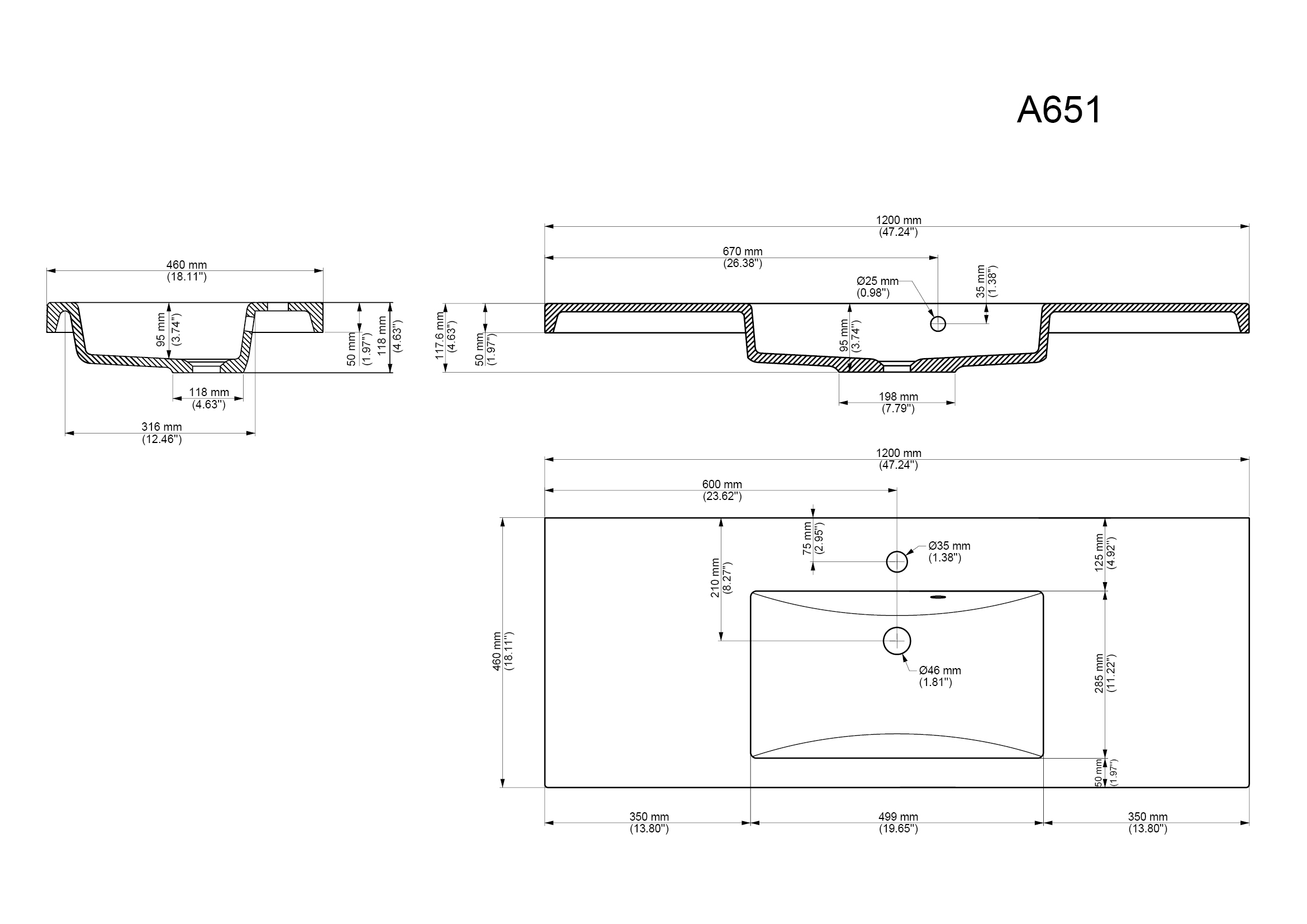 Waschbecken Mineralguss mit Überlauf (B/H/T) 120/5/46 cm.