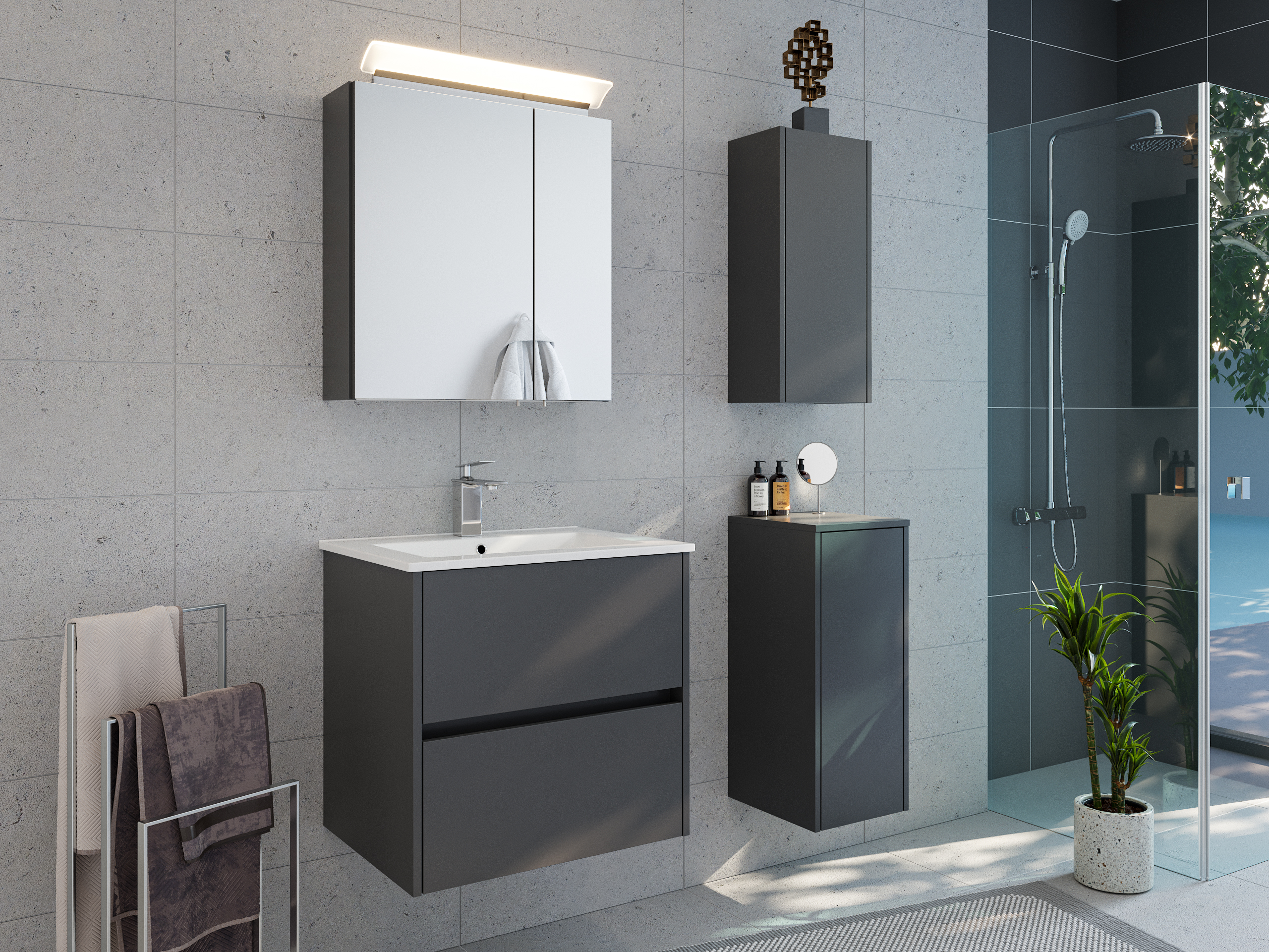Badmöbelset Taifun 60cm 4tlg mit Spiegelschrank & 2x Badschrank grafit