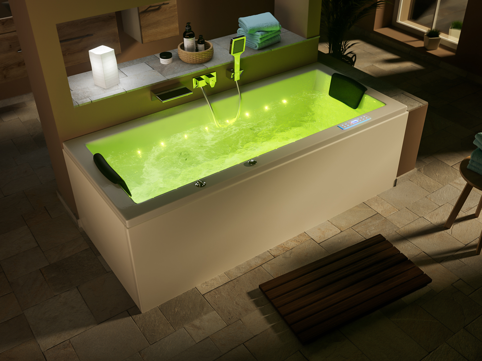 Entspanntes Baden mit Chromotherapie. Die Lichterketten jeweils auf beiden Seiten der Whirlwanne erleuchten das Wasser in allen Regenbogenfarben und bewirken eine sehr schöne Atmosphäre. Die Farben wechseln automatisch von Rot, Grün und Blau. Ganz einfach über das Bedienpanel die Wasserbeleuchtung anschalten.