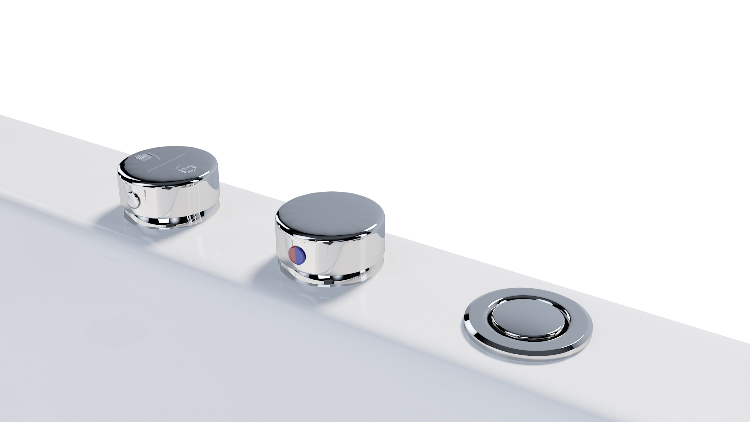 Zur Ausstattung des ULTRA-Whirlpools gehört die 2er-Armatur. Sie besteht aus zwei Drehkäufen, der eine mischt in einem Schalter das Kalt- und Warmwasser sowie die Wassermenge reguliert. Der andere Knauf ist ein Umschalter zur Handbrause bzw. zur Befüllung über den Überlauf.