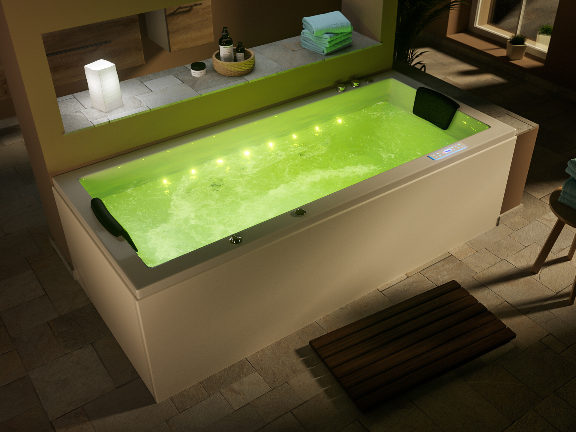 Entspanntes Baden mit Chromotherapie. Die Lichterketten jeweils auf beiden Seiten der Whirlwanne erleuchten das Wasser in allen Regenbogenfarben und bewirken eine sehr schöne Atmosphäre. Die Farben wechseln automatisch von Rot, Grün und Blau. Ganz einfach über das Bedienpanel die Wasserbeleuchtung anschalten.