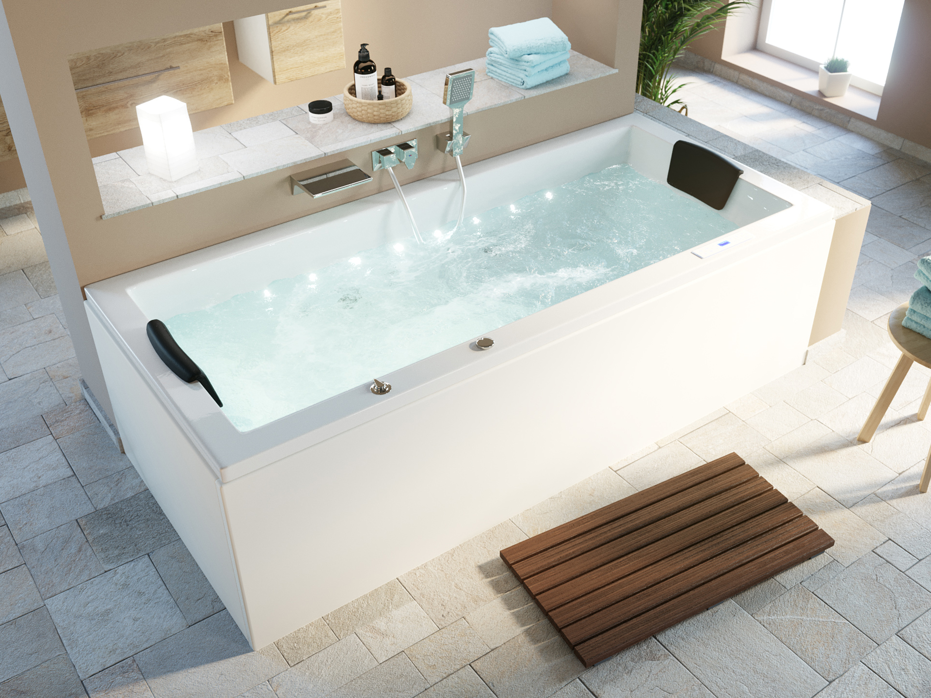 | Lieferumfang | Whirlpool-Wanne, 12 V LED-Beleuchtung, Luftbeimischventil, Ab- und Überlauf |