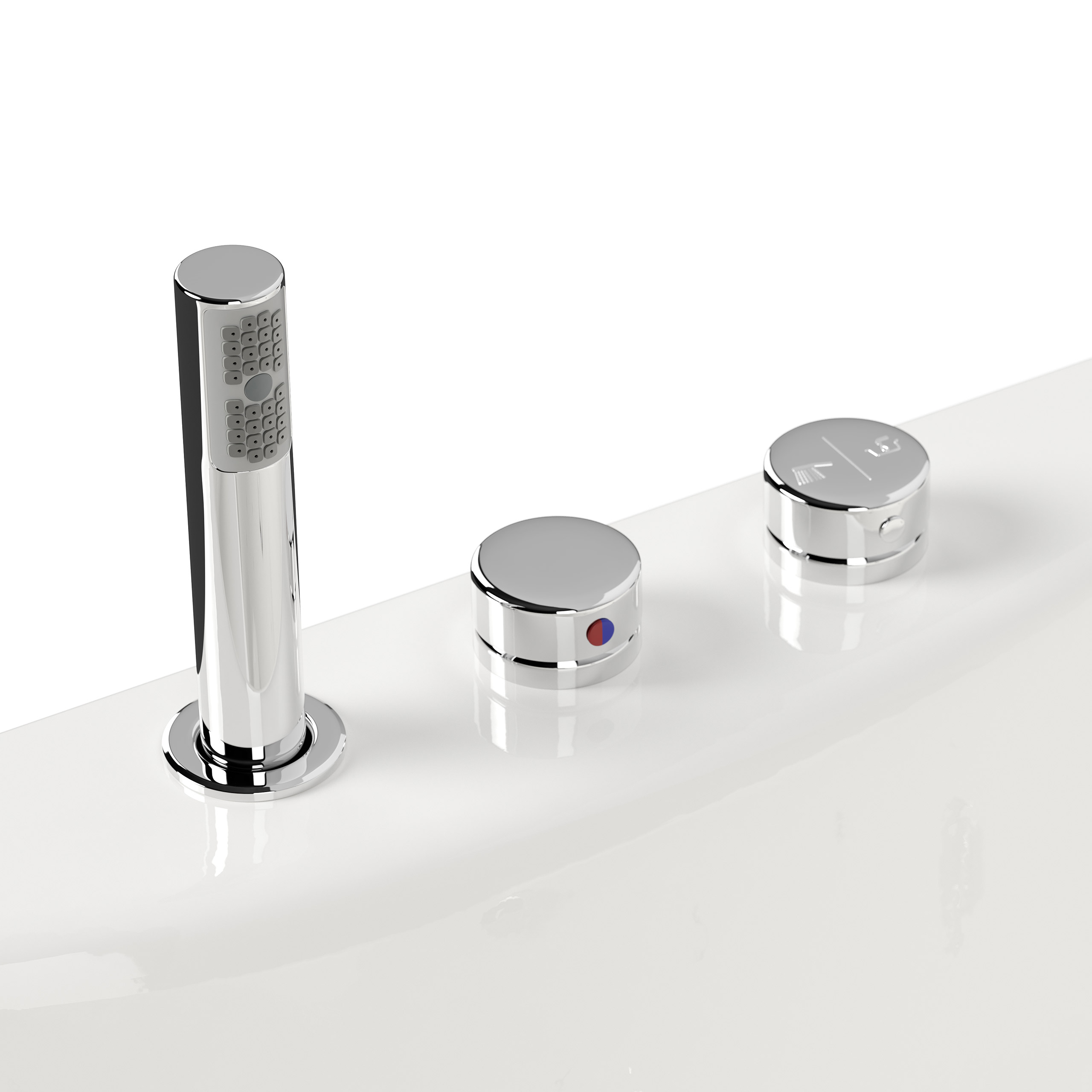 Zur Ausstattung des ULTRA-Whirlpools gehört die 2er-Armatur. Sie besteht aus zwei Drehkäufen, der eine mischt in einem Schalter das Kalt- und Warmwasser sowie die Wassermenge reguliert. Der andere Knauf ist ein Umschalter zur Handbrause bzw. zur Befüllung über den Überlauf.