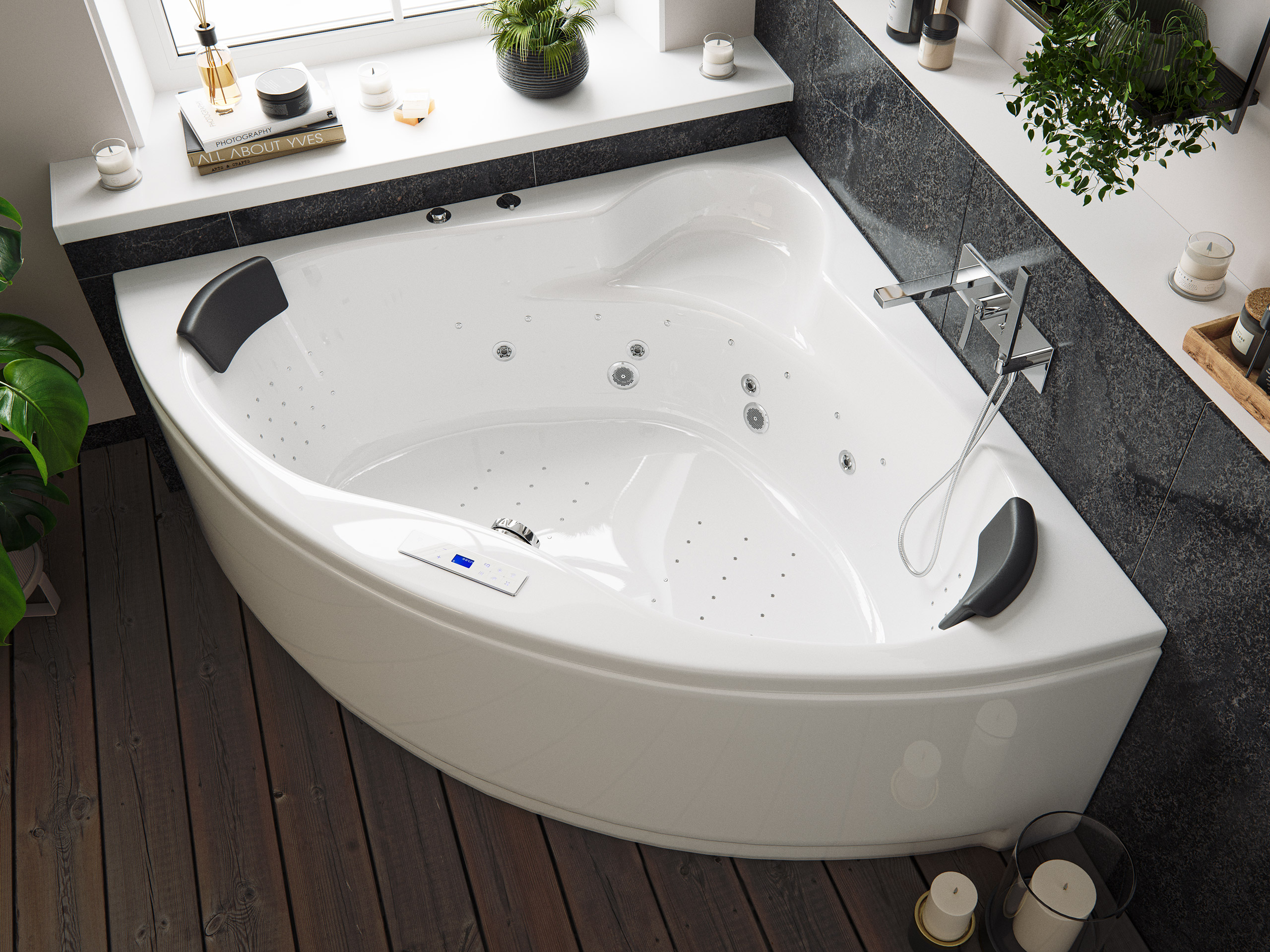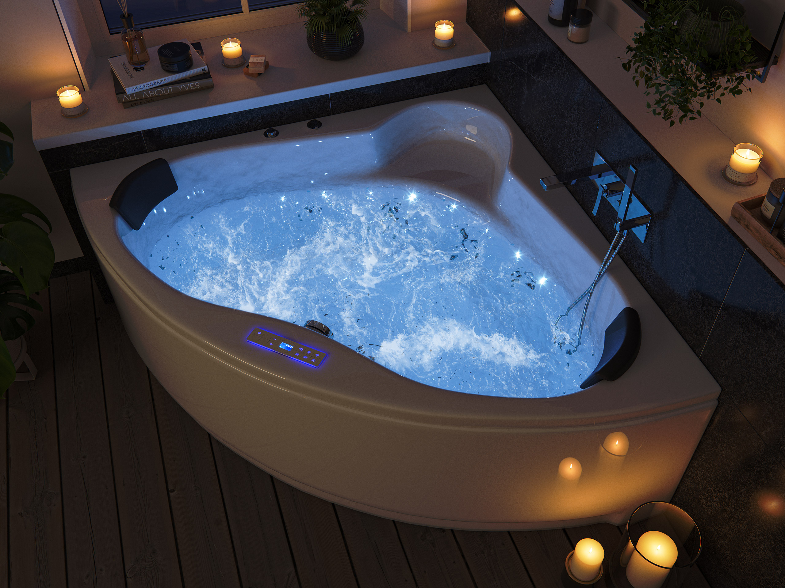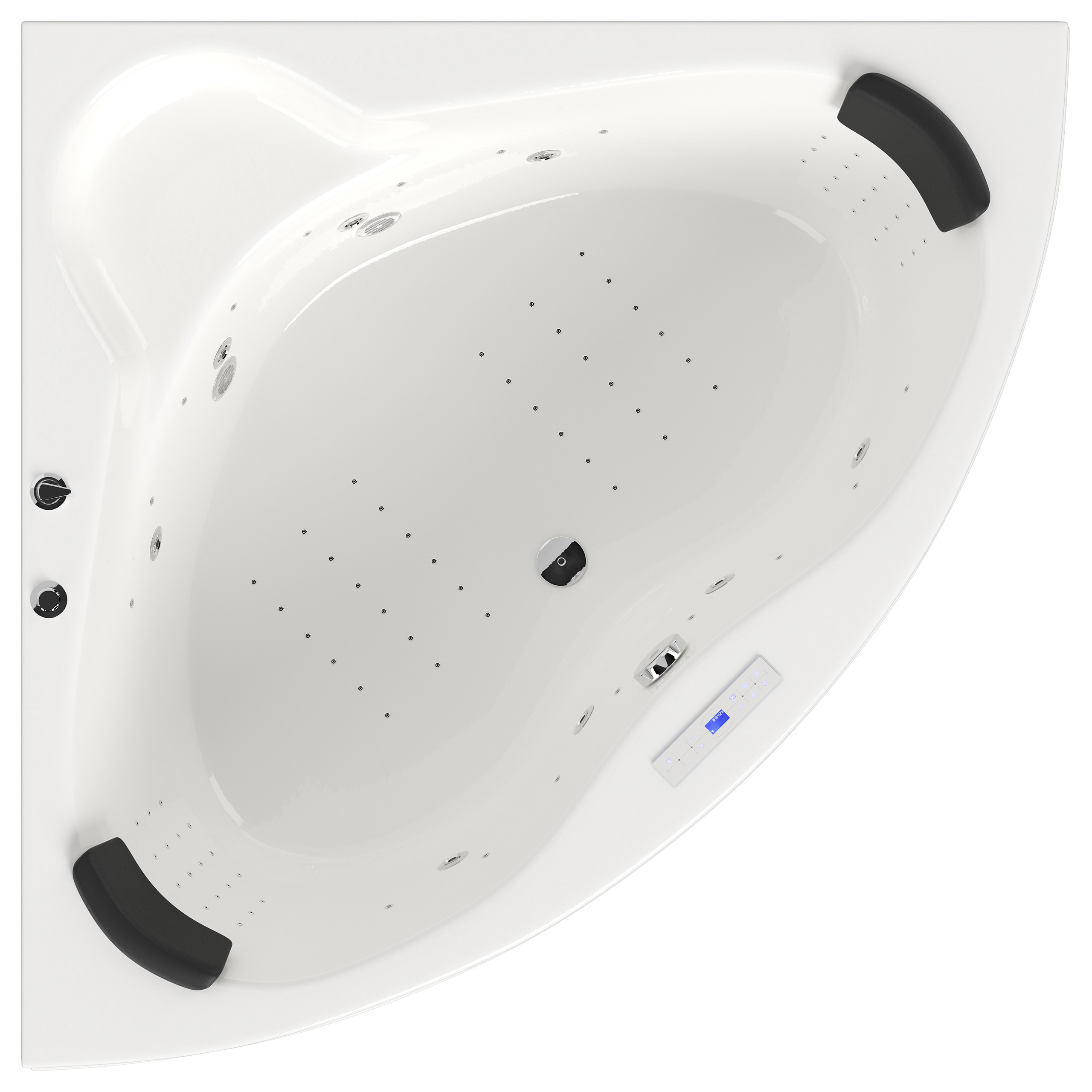 Whirlwanne in Dreiecksform für private Badezimmer mit außergewöhnlich leistungsstarken Massagedüsen