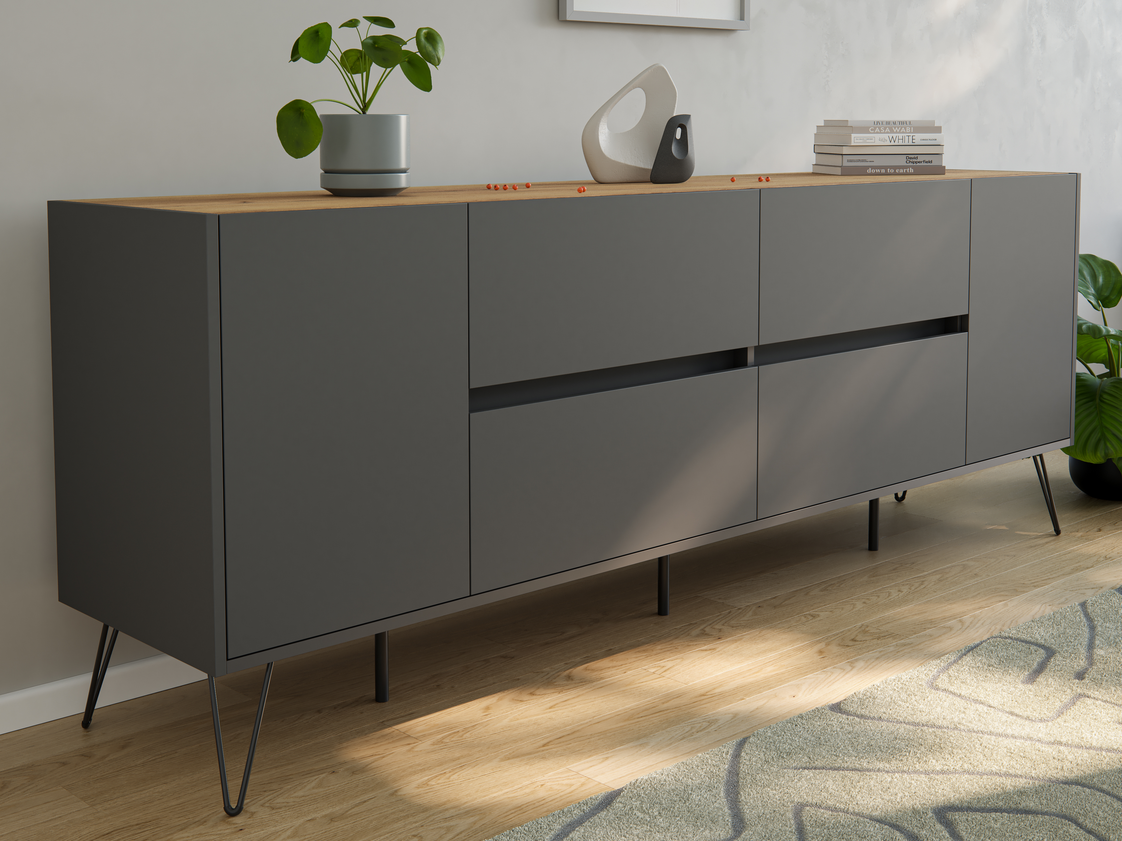 Das Möbel muss von mindestens zwei Personen vertikal getragen werden. Bitte nicht kippen oder schräg anheben, um Beschädigungen oder Verletzungen zu vermeiden.