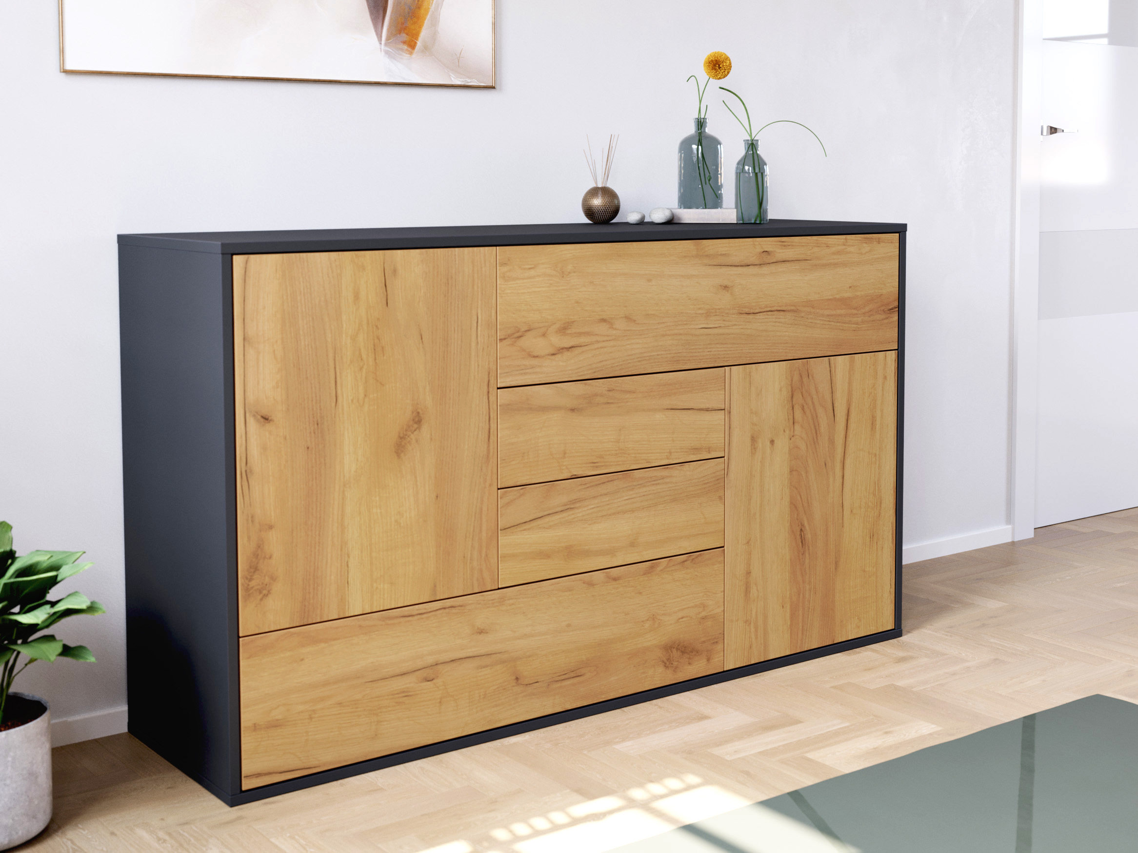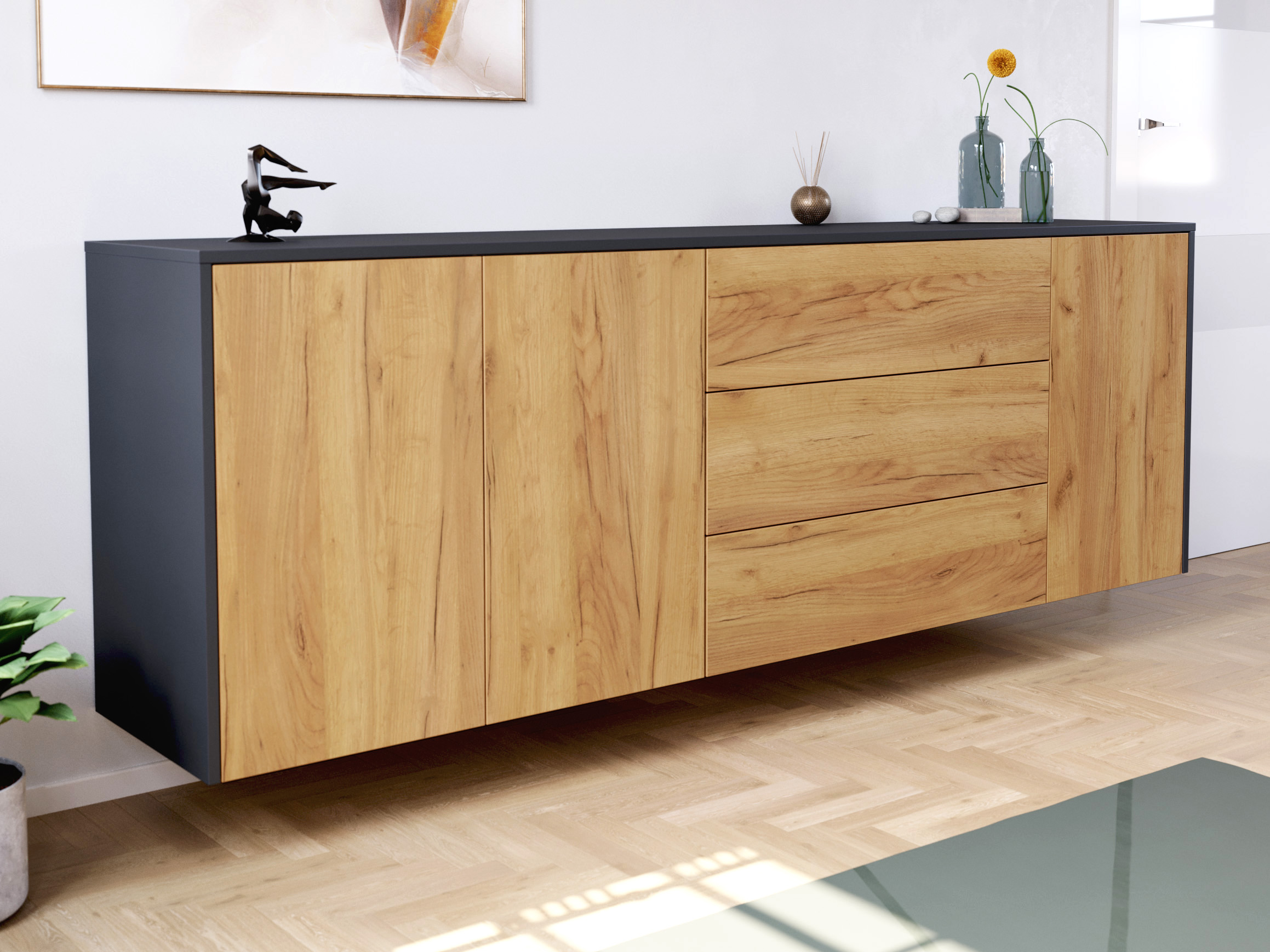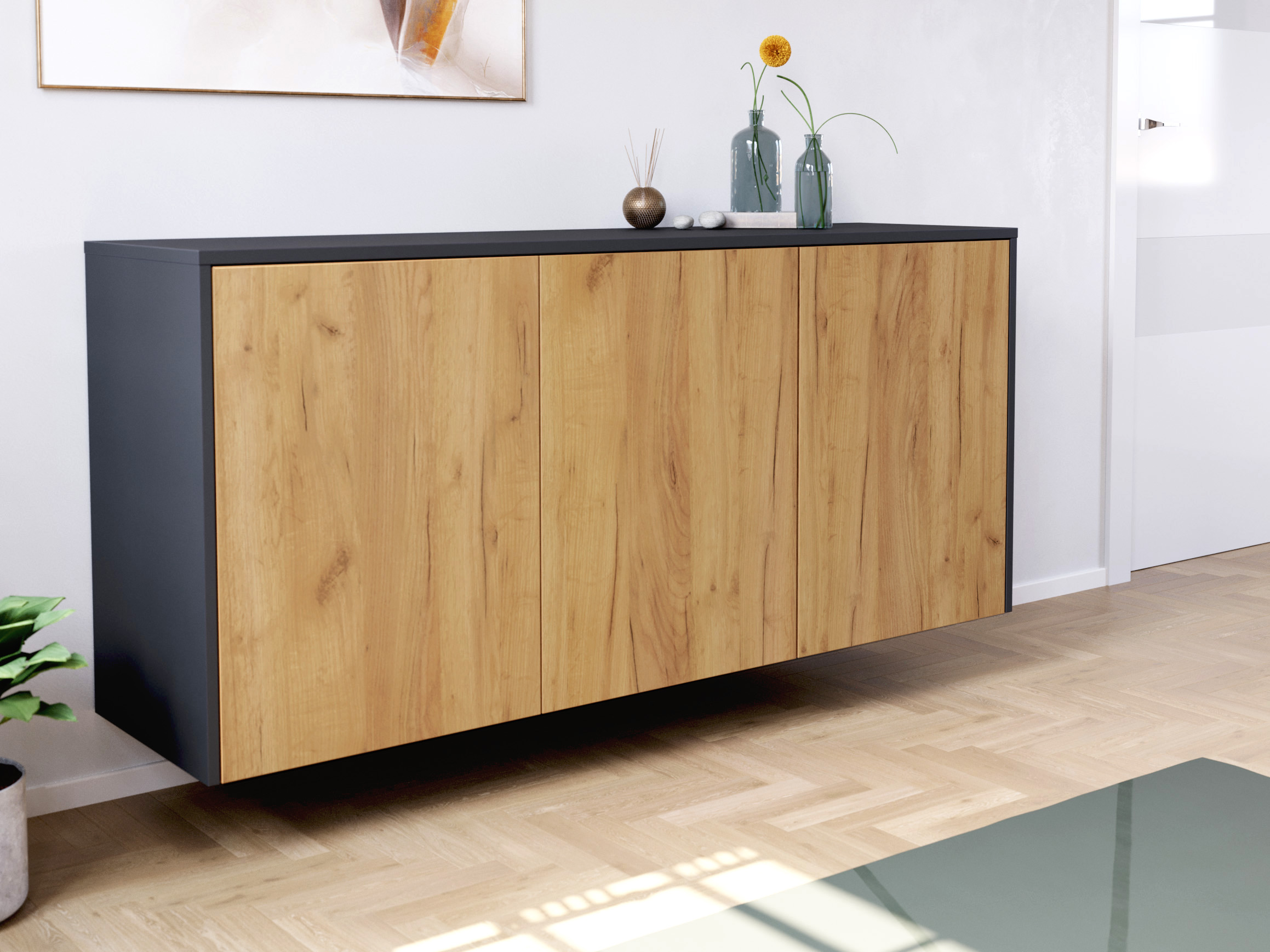 - Stabile Fronten und robuster Korpus: Die Fronten sind 18-19 mm dick. Deckplatte sowie Boden sind 16 mm dick. Die Rückwand ist eine leichte und solide 5 mm HDF (hochdichte Faserplatte).