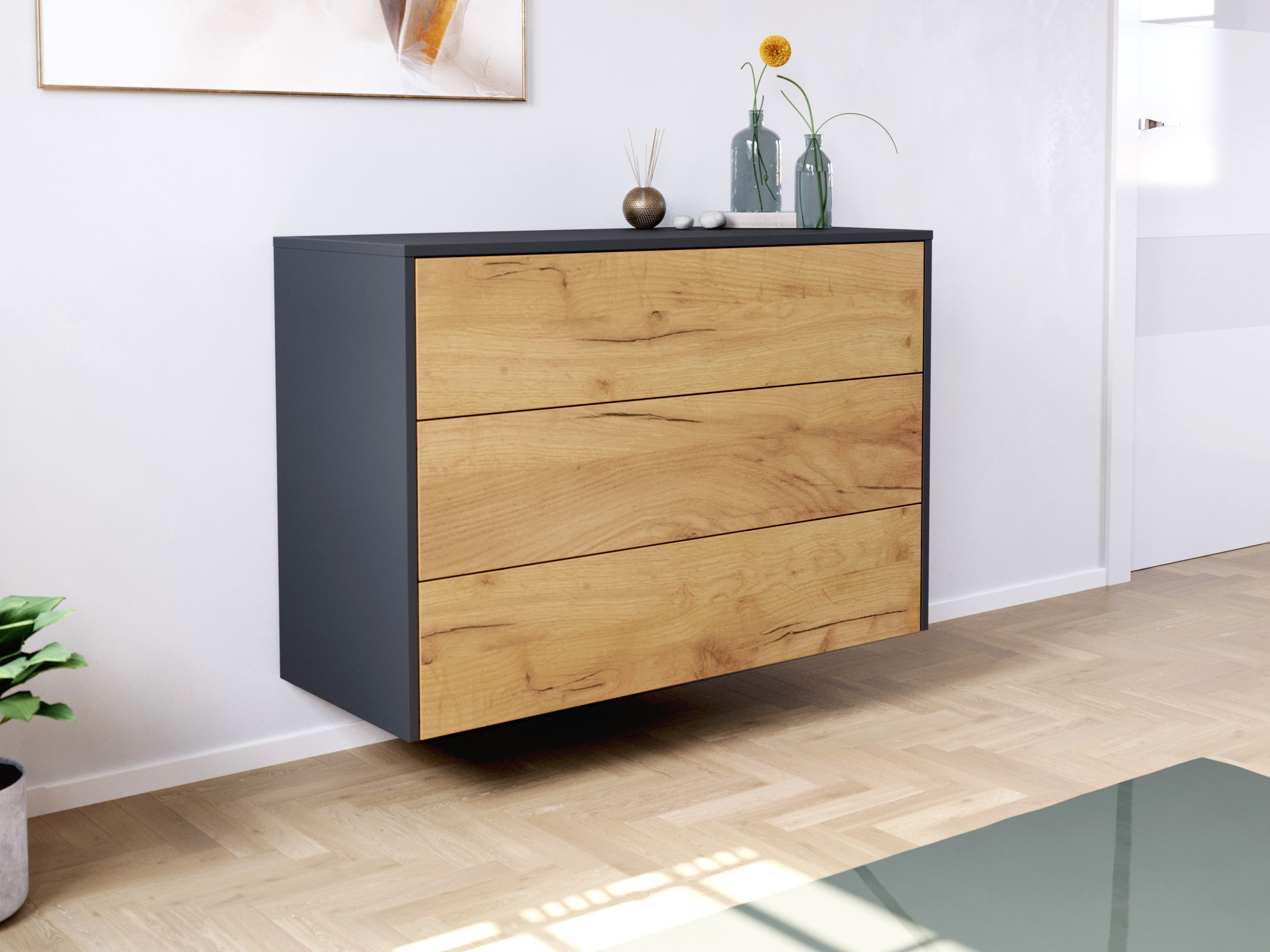 - Innenleben: Mit mattfarbenem Melamin sind die Schubladen beschichtet, in der Regel ebenso ggf. die Innenflächen der Rückwände und Türen.