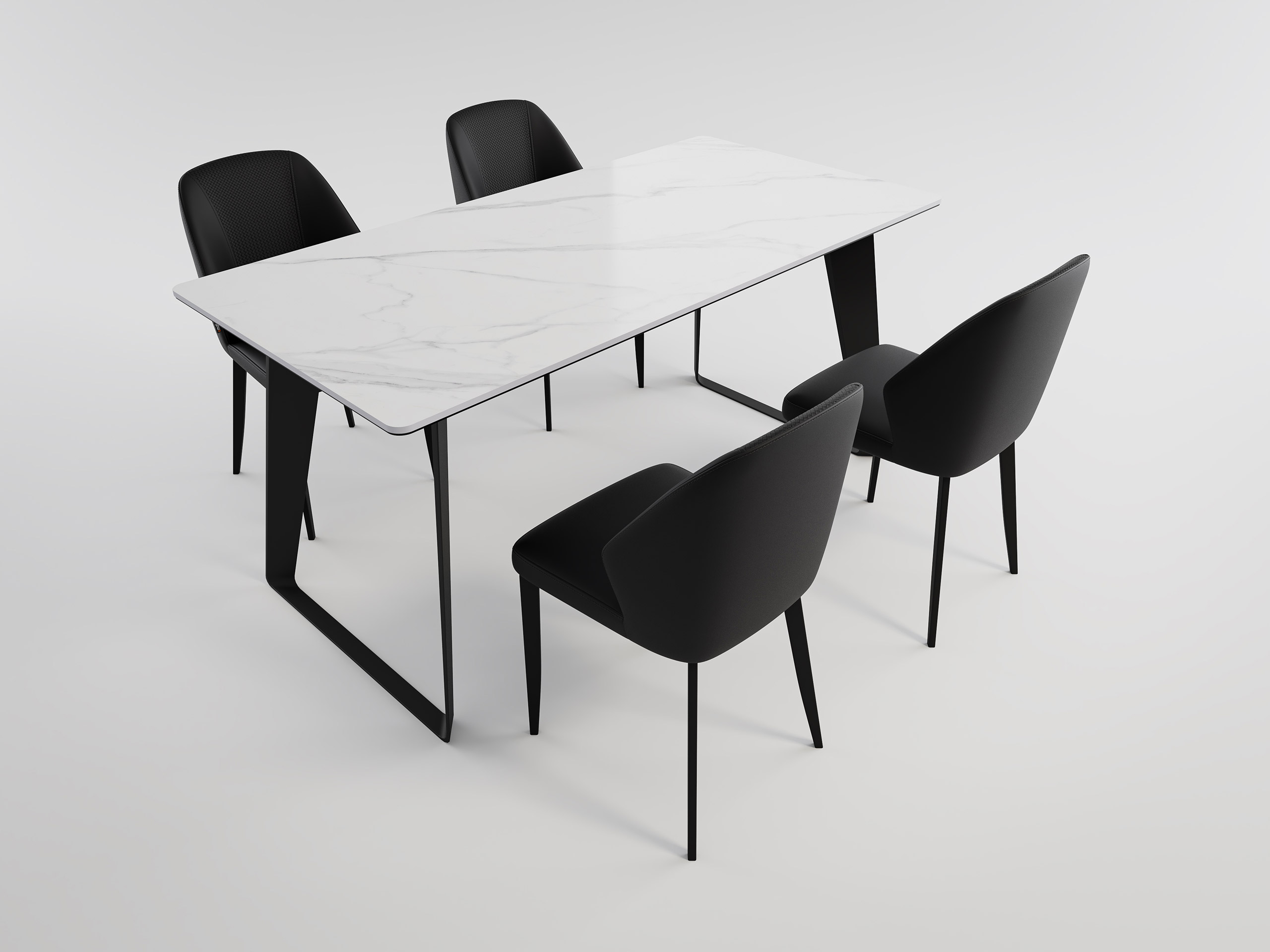 Esstisch Set FLORINT 160 weiße Keramikplatte mit 4 Stühlen Kunstleder schwarz