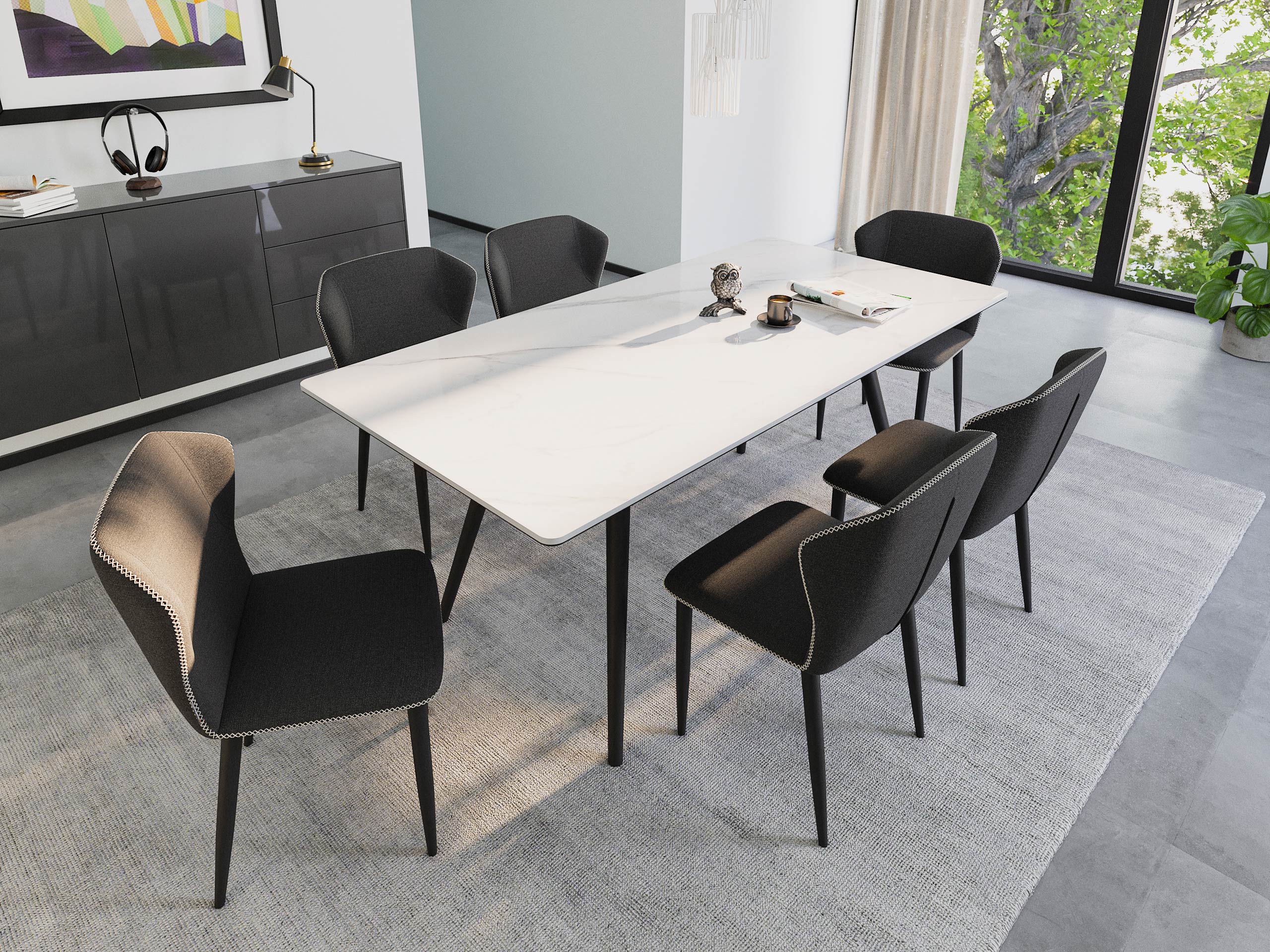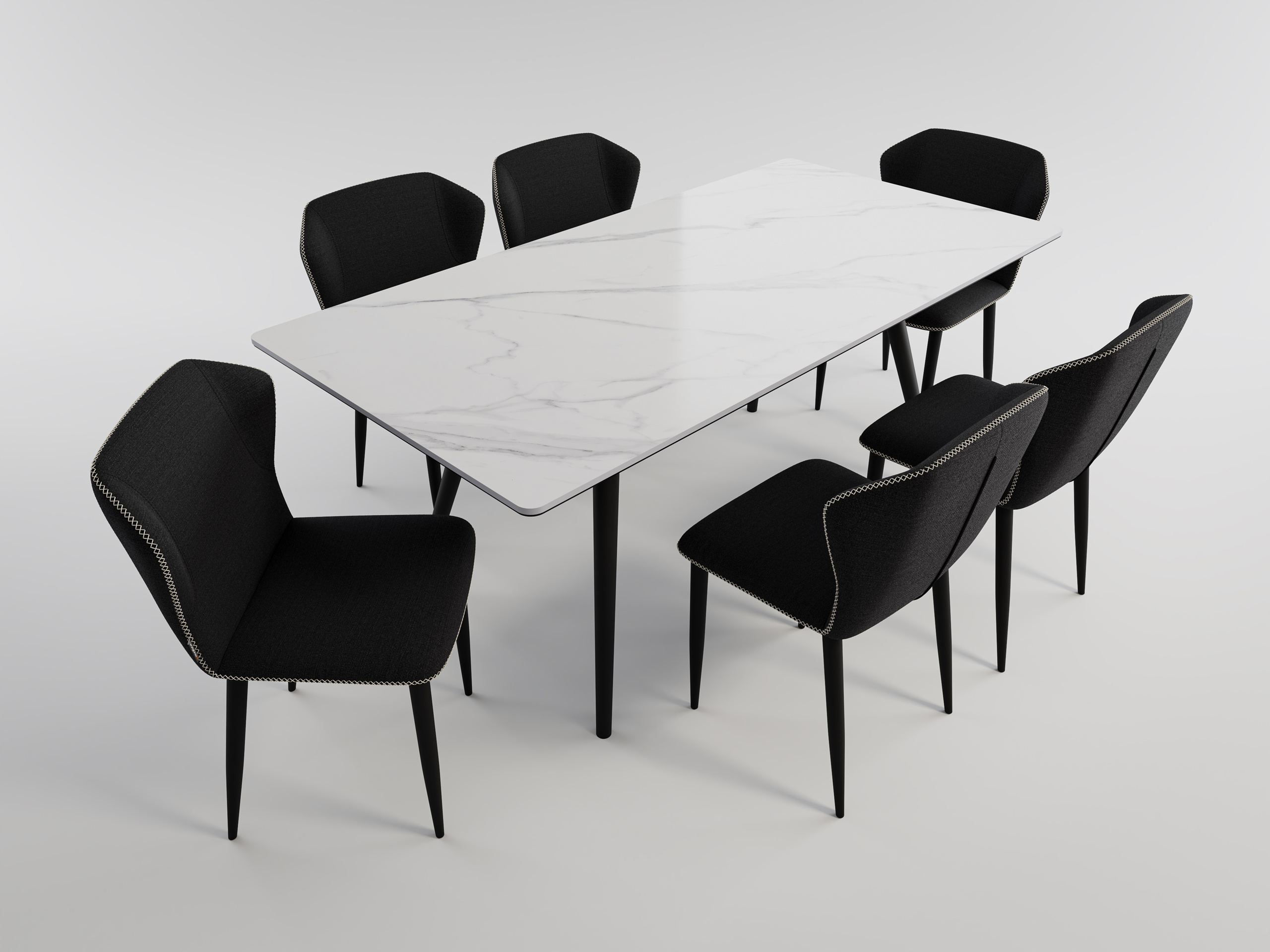 Esstisch Set RIGA 180 weiße Keramikplatte mit 6 Stühlen Stoffbezug schwarz