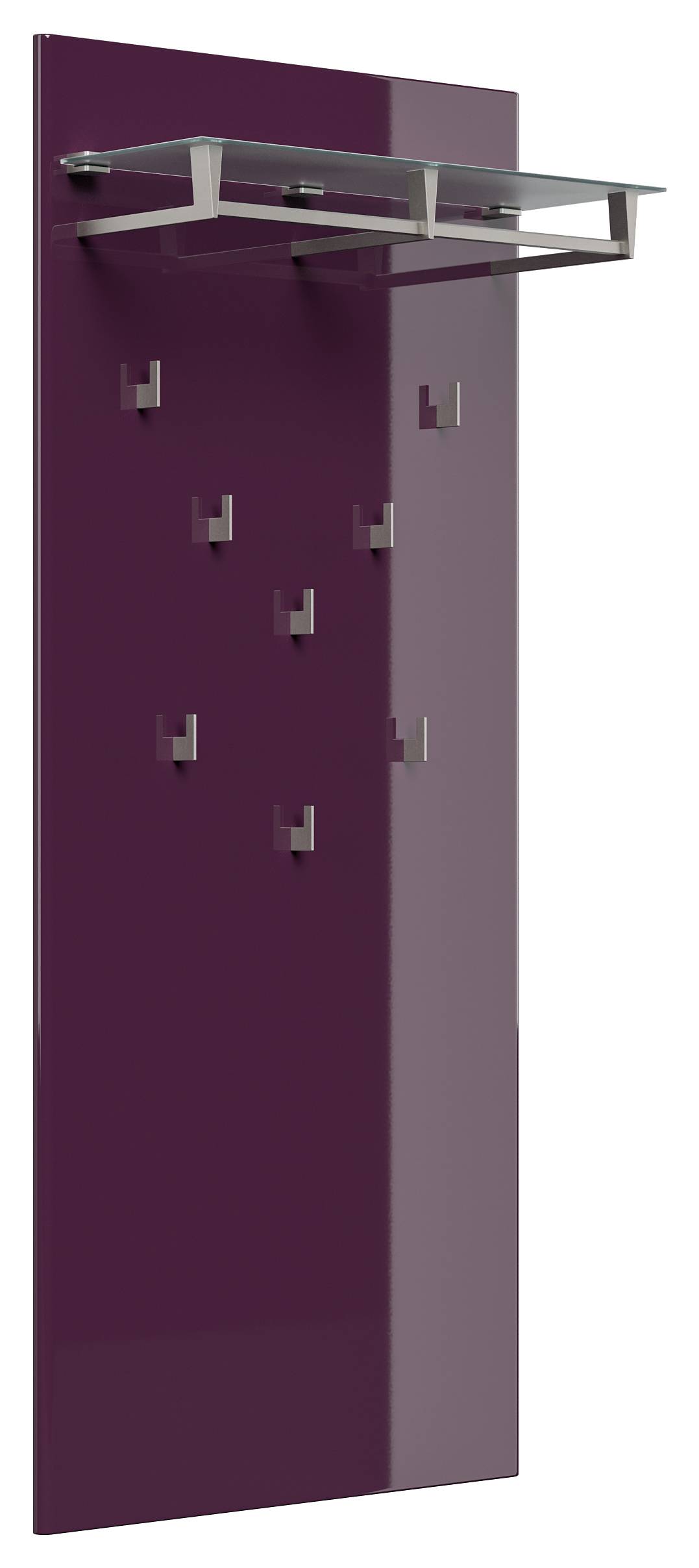 Schuhschrank, 8 Klappen (B/H/T) 104,8/186,9/31,6 cm. Geeignet für mind. 32 Paar Schuhe.Garderobe (B/H/T) 70/160/26,6 cm mit 8 Haken, Hutablage aus Glas auf Metallhalterung.