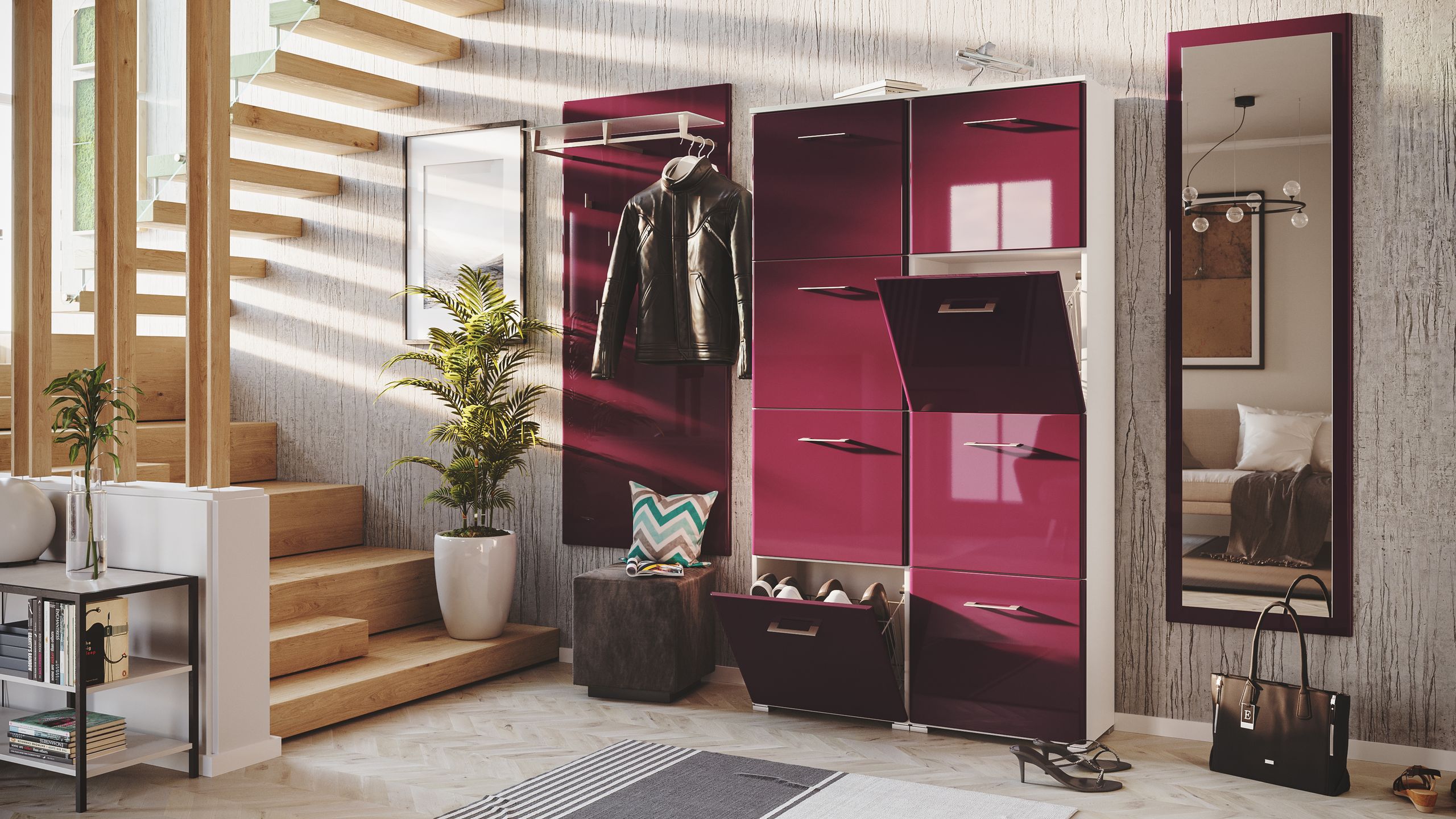 Garderobe Set Emotion 3 tlg Schuhschrank 8 Klappen 32 Paar Weiss-Brombeer