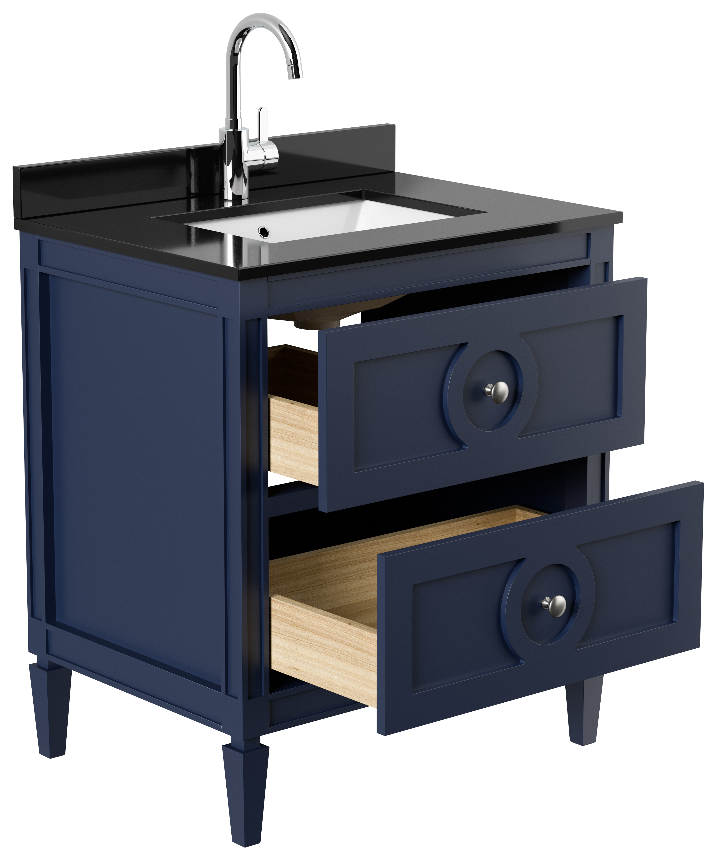Der Korpus und die Fronten des Waschtischunterschranks sind aus massivem Birken- oder Kirschholz gefertigt. Die obere(n) Schublade(n) haben eine Aussparung für den Siphon (siehe Foto).