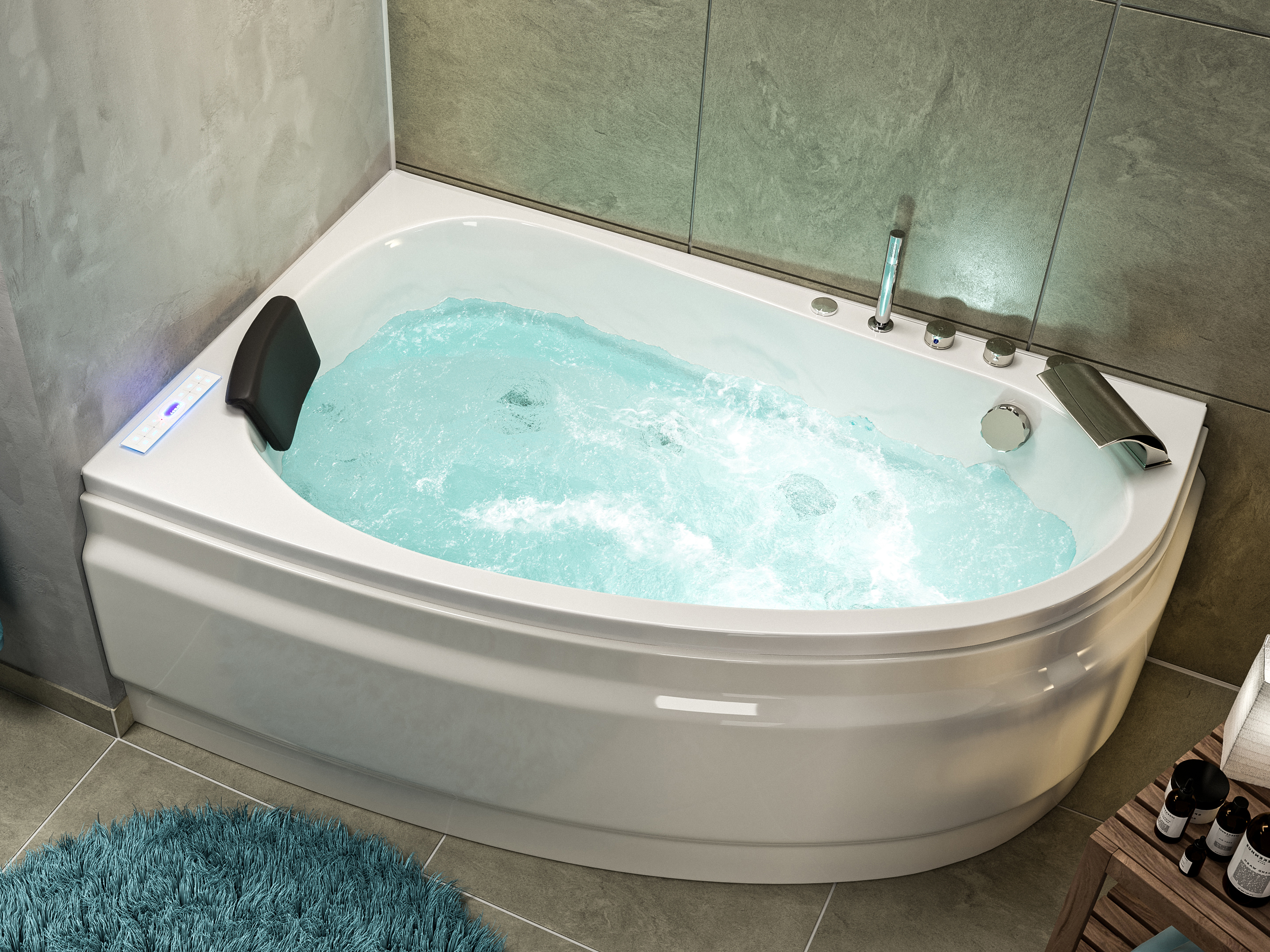 Vorteile: Dezente Strahler seitlich. Automatischer Farbwechsel mit gleichmäßiger Wasserbeleuchtung. Intensive Farben leuchten unter Wasser. Entspanntes Baden mit Chromotherapie.Massagefunktion: Düsen-Ausstattung