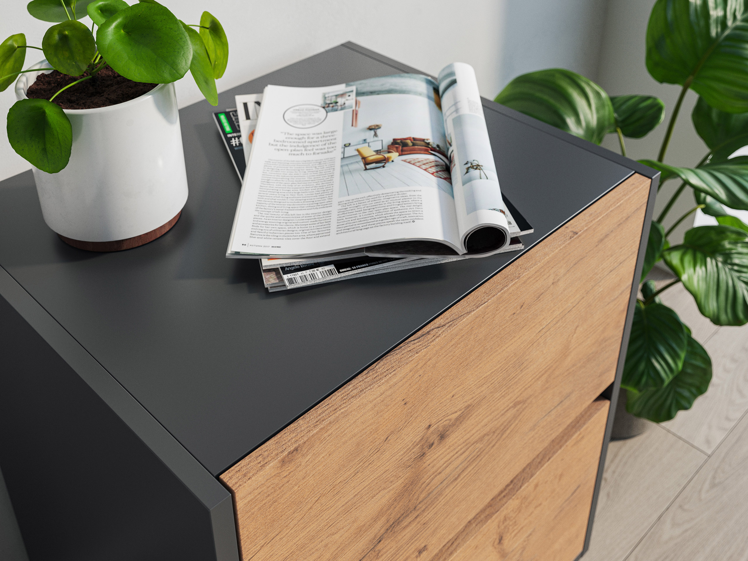 Nachttisch Yako 50cm 2 SoftClose stehend Grafit & Eiche Front