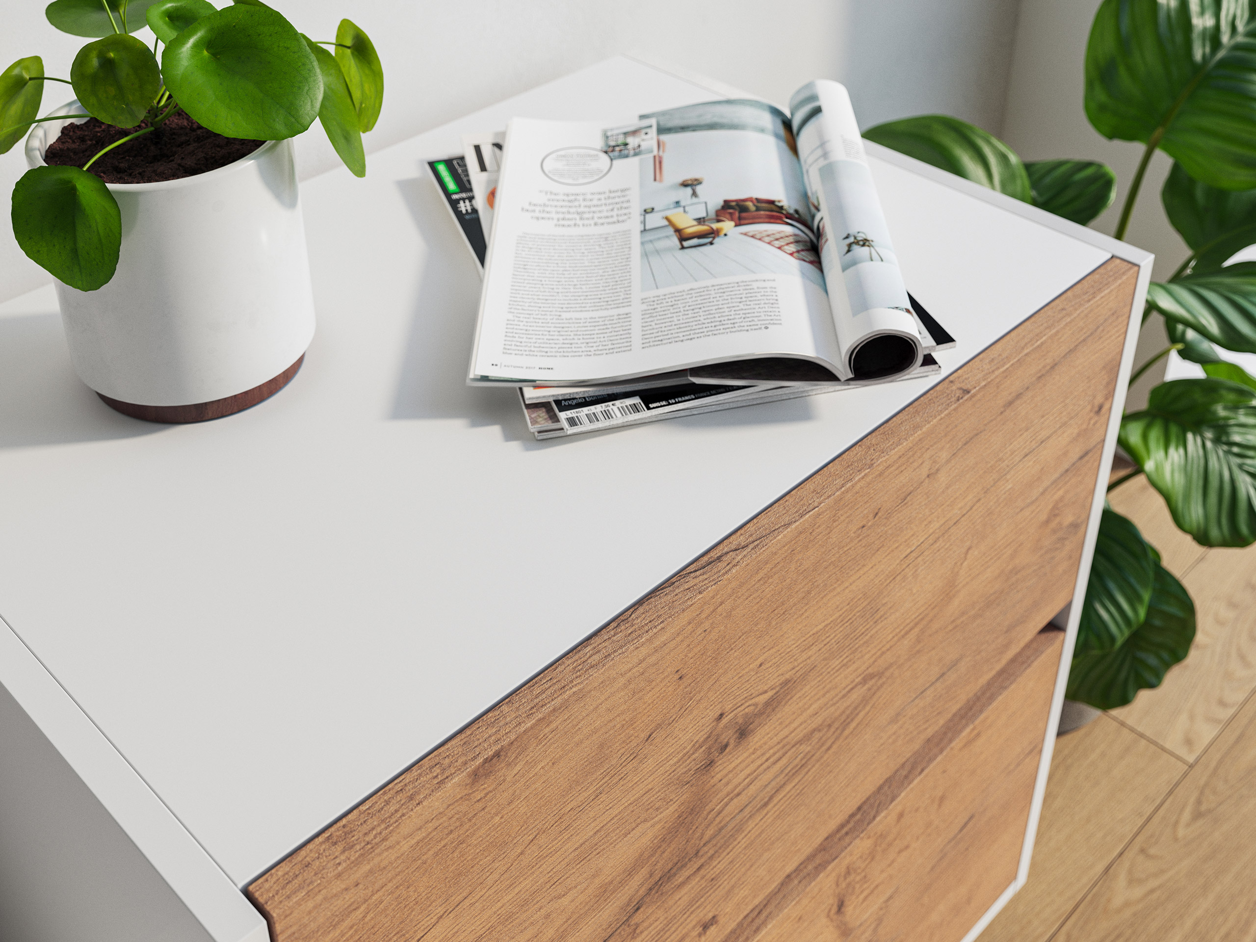 - Innenleben: Mit mattfarbenem Melamin sind die Schubladen beschichtet, in der Regel ebenso ggf. die Innenflächen der Rückwände und Türen.