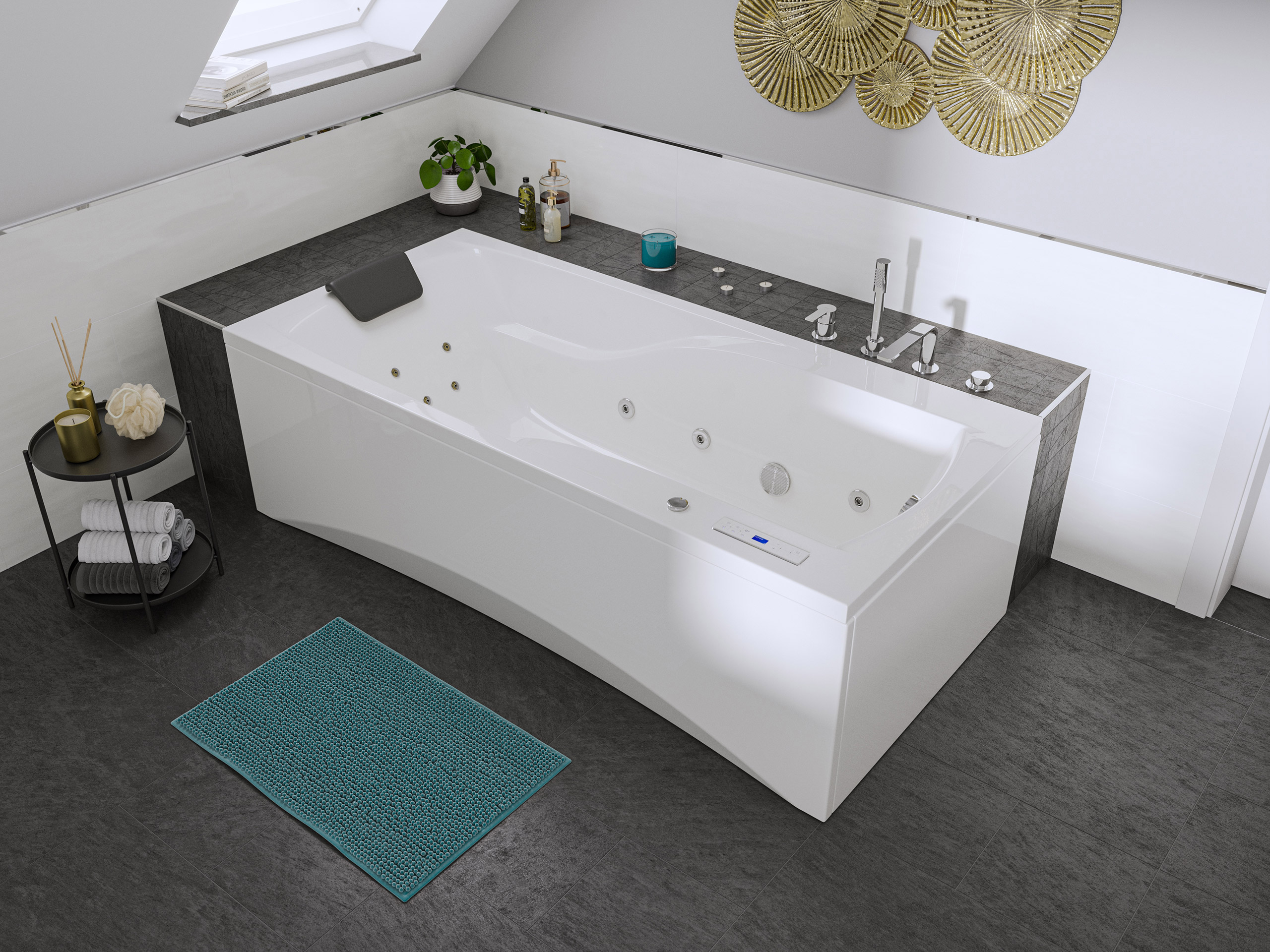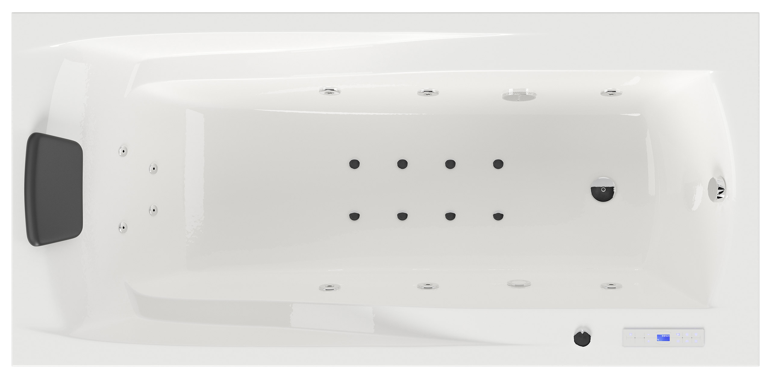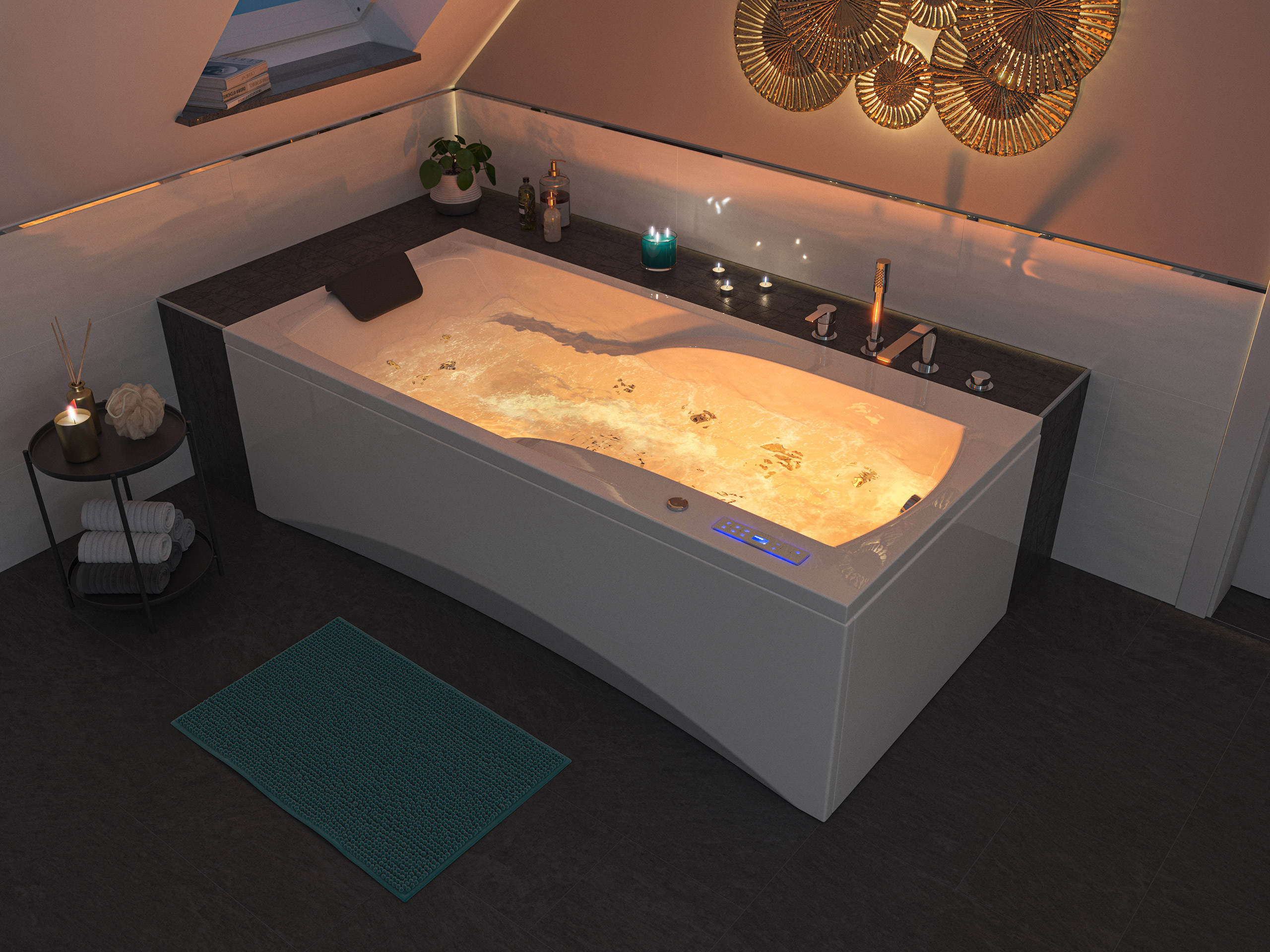 Vorteile: Dezente Strahler seitlich. Automatischer Farbwechsel mit gleichmäßiger Wasserbeleuchtung. Intensive Farben leuchten unter Wasser. Entspanntes Baden mit Chromotherapie.Massagefunktion: Düsen-Ausstattung
