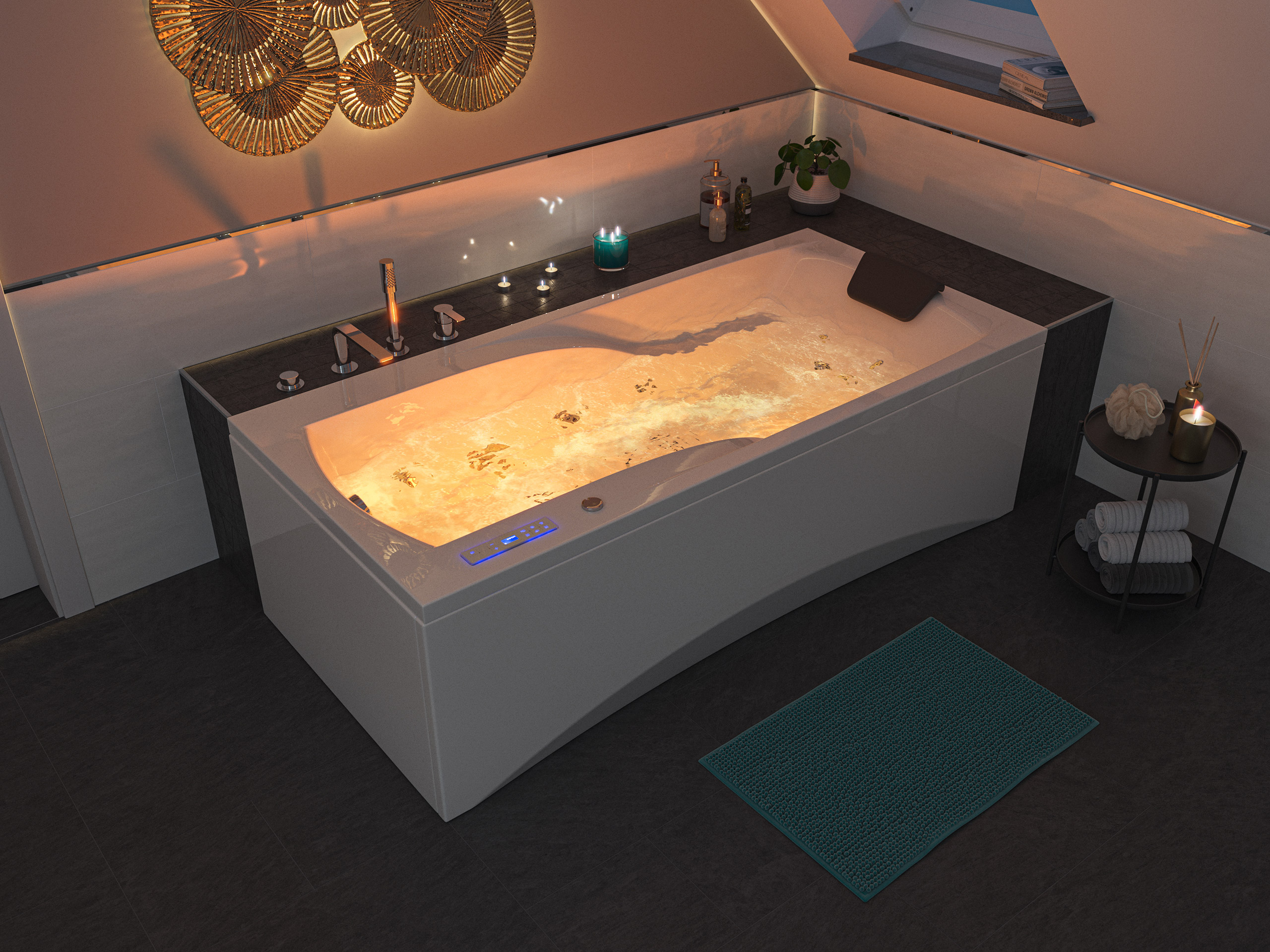 Entspanntes Baden mit Chromotherapie. Die Lichterketten jeweils auf beiden Seiten der Whirlwanne erleuchten das Wasser in allen Regenbogenfarben und bewirken eine sehr schöne Atmosphäre. Die Farben wechseln automatisch von Rot, Grün und Blau. Ganz einfach über das Bedienpanel die Wasserbeleuchtung anschalten.