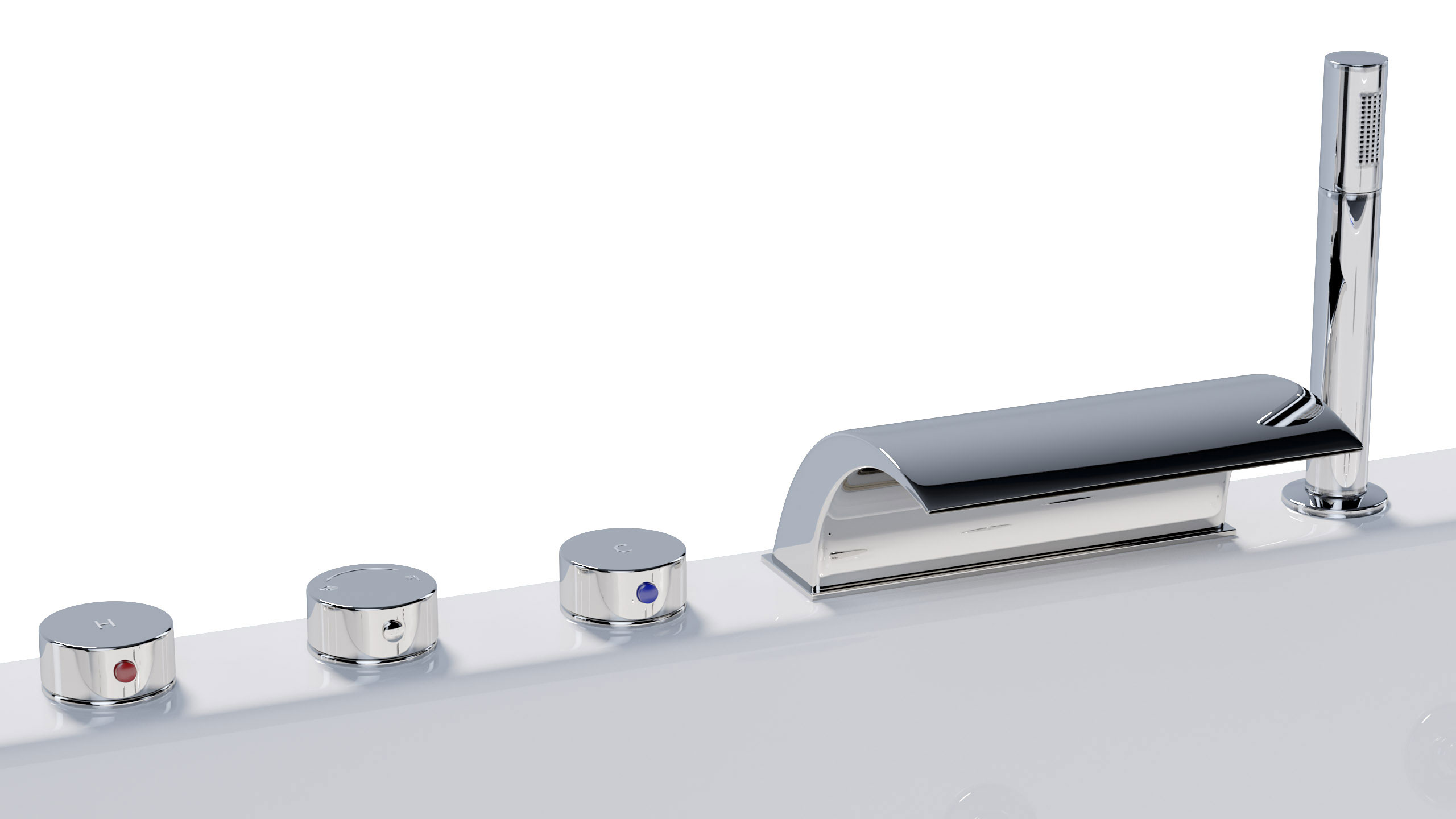 Zur kompletten Standard-Ausstattung gehören die 3er-Armatur (verchromte Messingarmatur mit Kunststoff-Kartusche), die Standard-Handbrause sowie der Wasserfall.