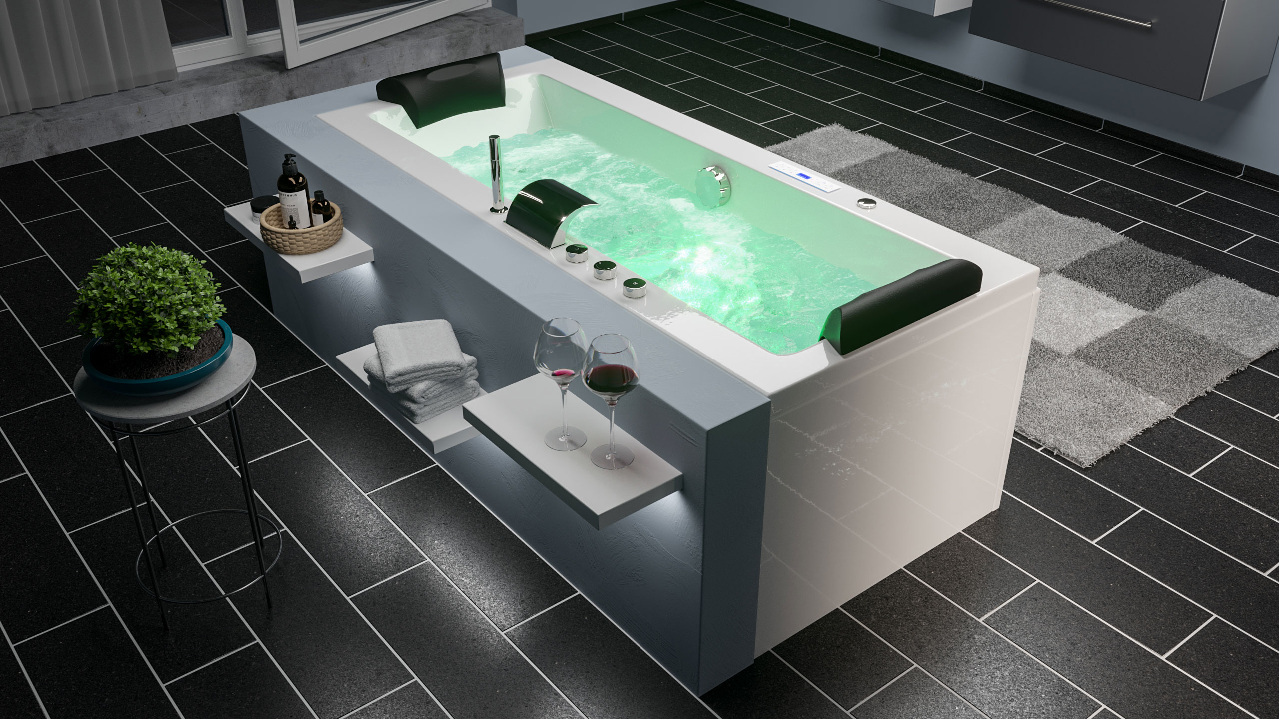 - Anschlussfertige Whirlpool-Wanne (Made in Germany) mit Rahmen auf höhenverstellbaren Füßen.