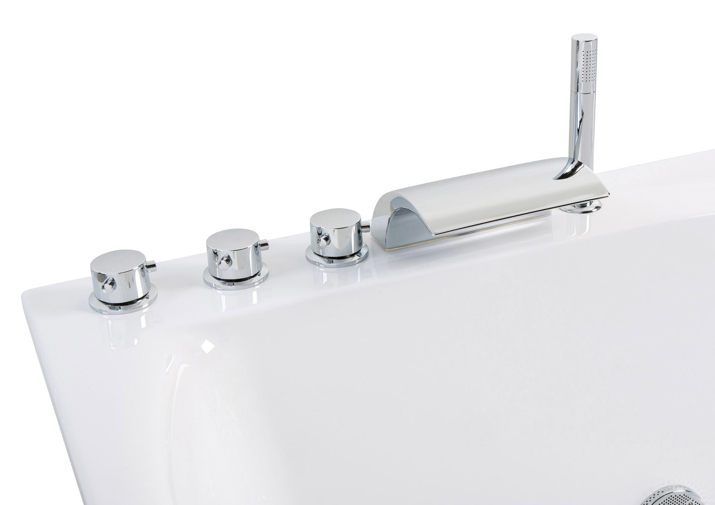 | Lieferumfang | Whirlpool-Wanne, 12 V LED-Beleuchtung, Luftbeimischventil, 3er-Armatur, Handbrause und Wasserfall-Armatur, Ab- und Überlauf |