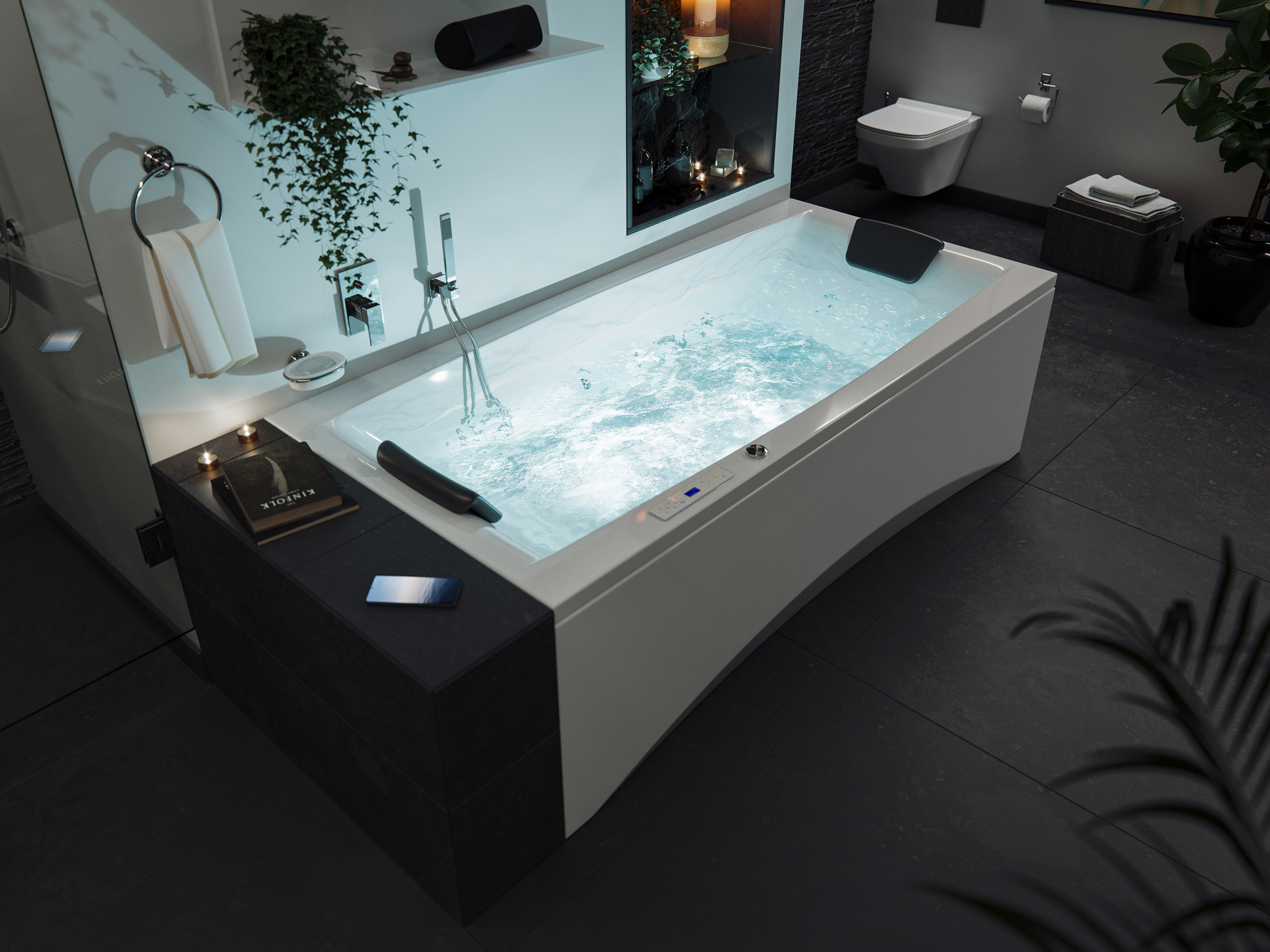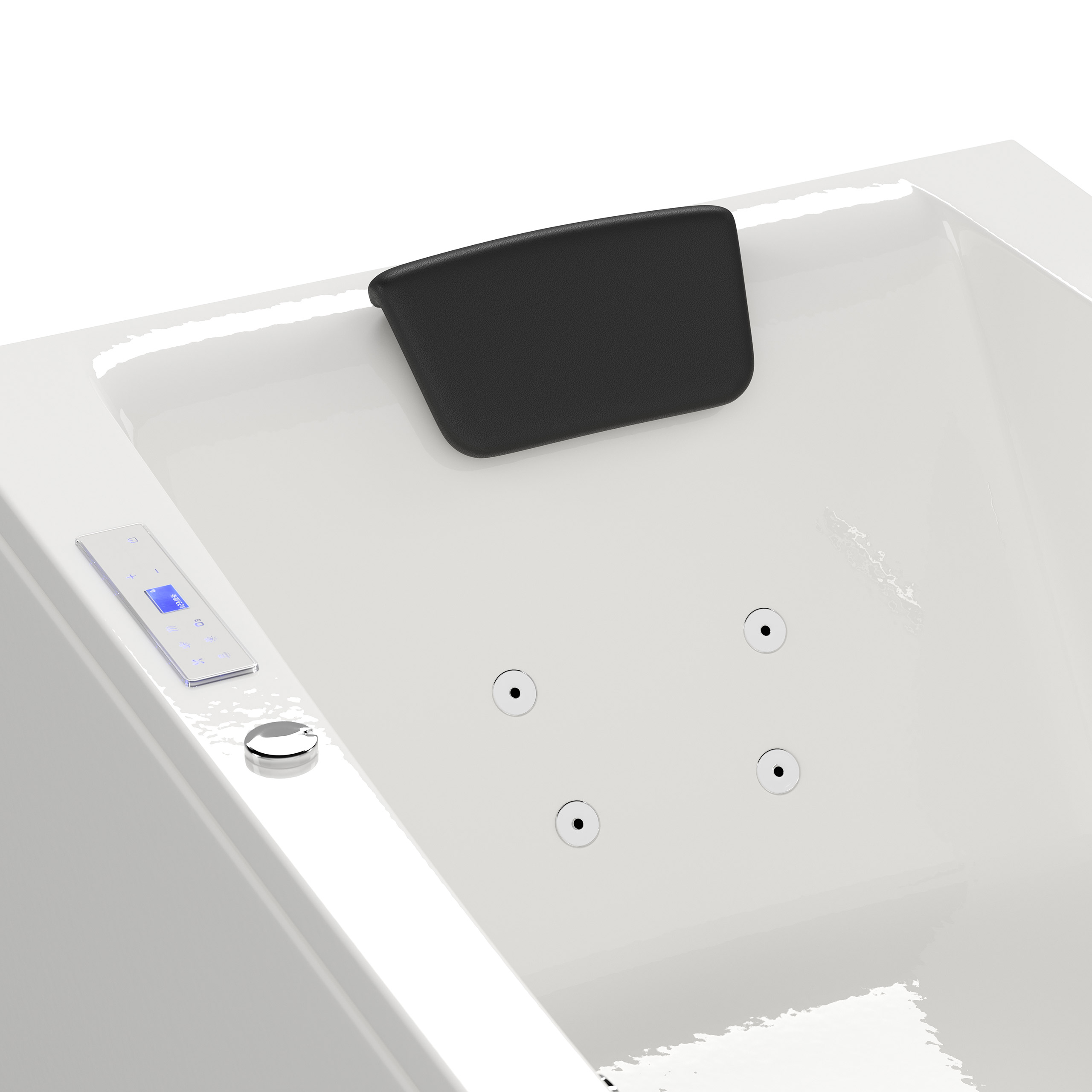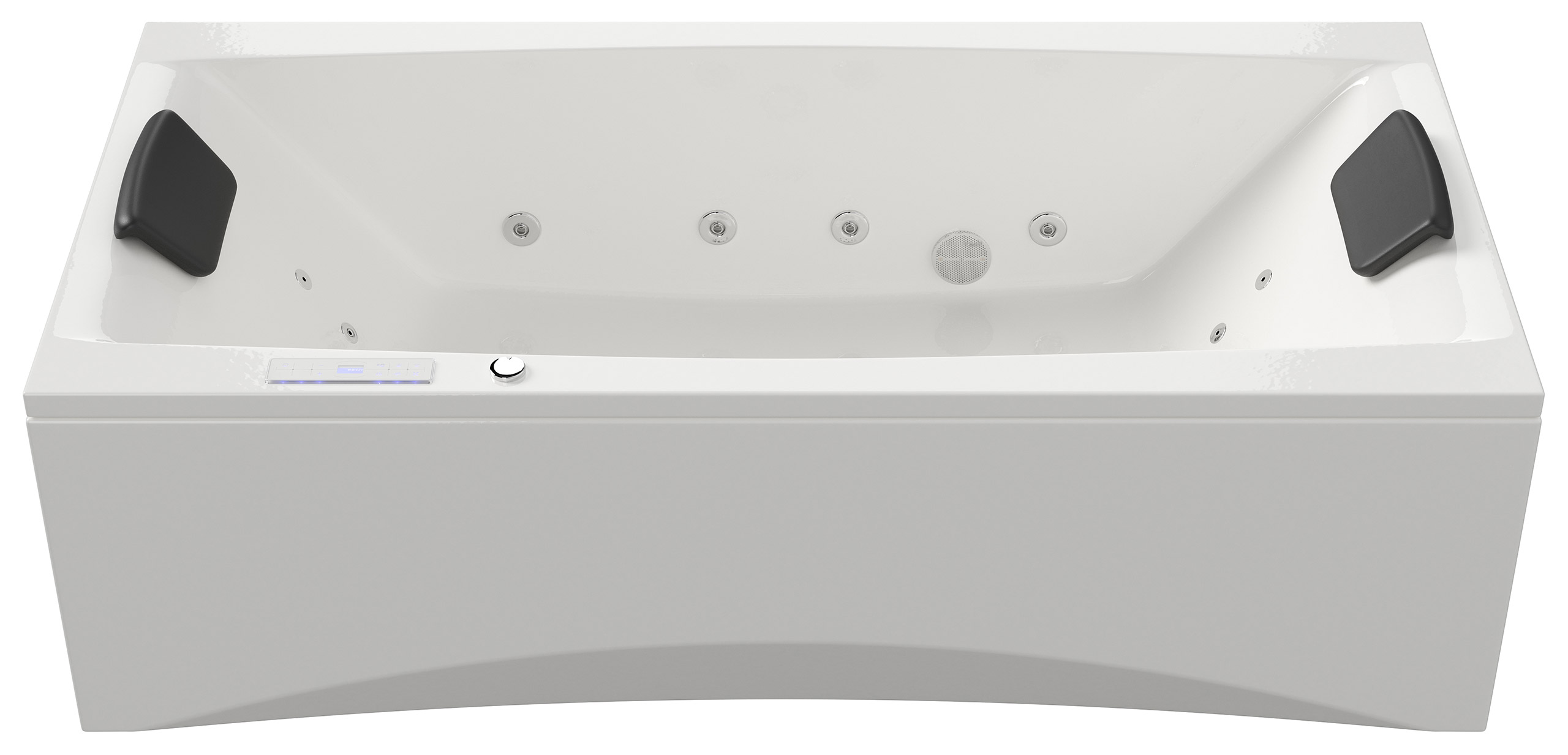 Vorteile: Dezente Strahler seitlich. Automatischer Farbwechsel mit gleichmäßiger Wasserbeleuchtung. Intensive Farben leuchten unter Wasser. Entspanntes Baden mit Chromotherapie.Massagefunktion: Düsen-Ausstattung