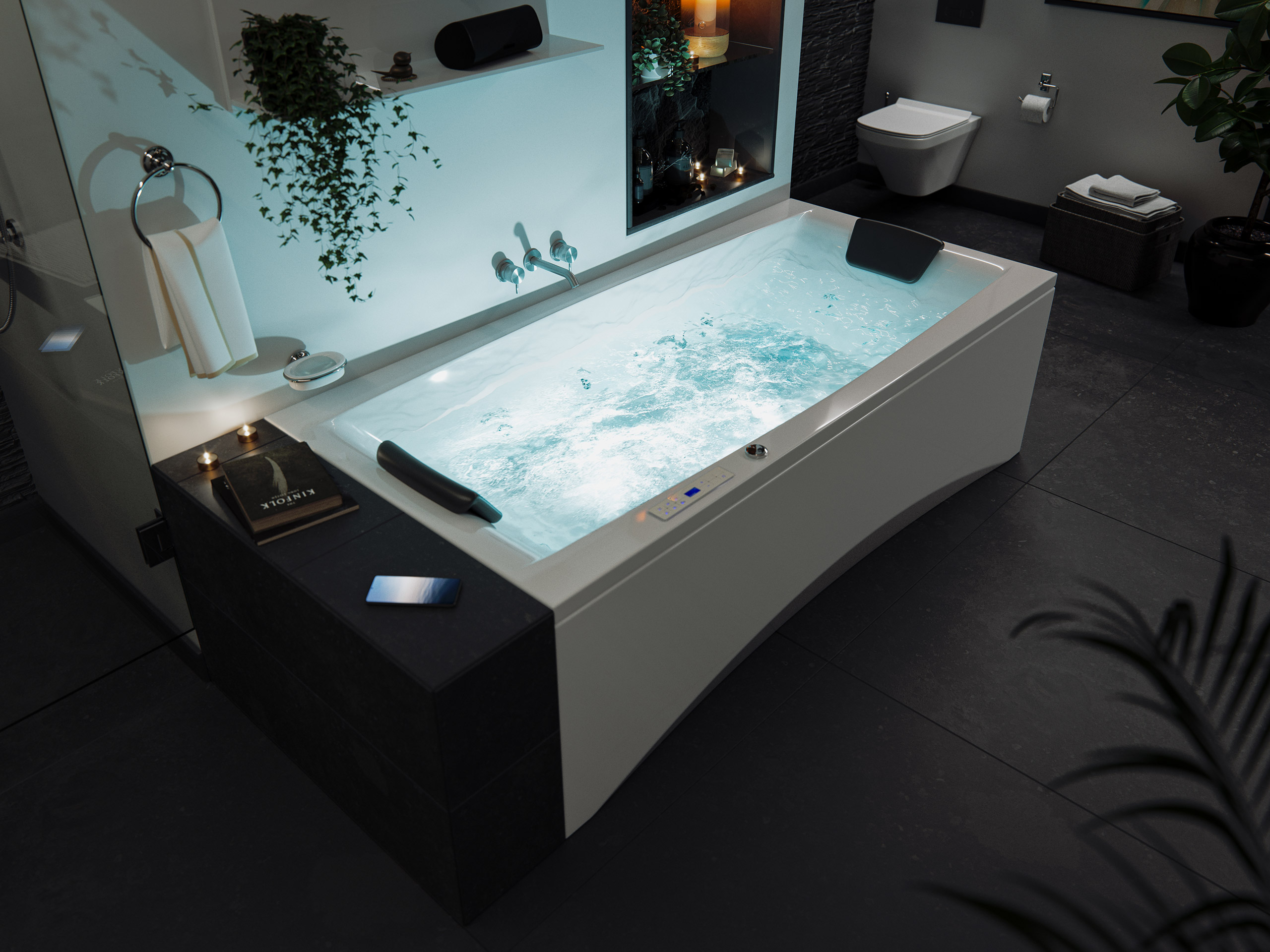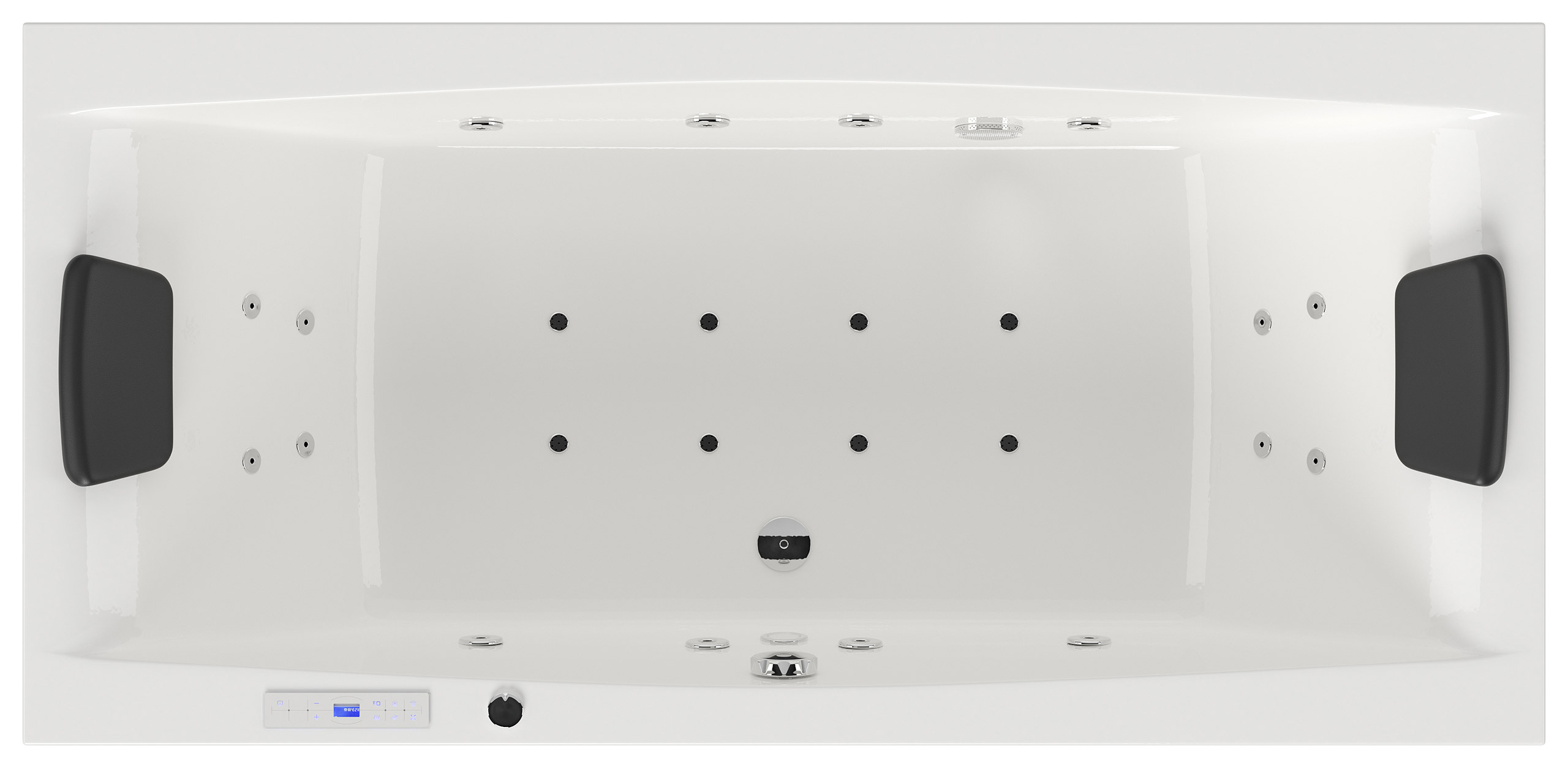 Vorteile: Dezente Strahler seitlich. Automatischer Farbwechsel mit gleichmäßiger Wasserbeleuchtung. Intensive Farben leuchten unter Wasser. Entspanntes Baden mit Chromotherapie.Massagefunktion: Düsen-Ausstattung