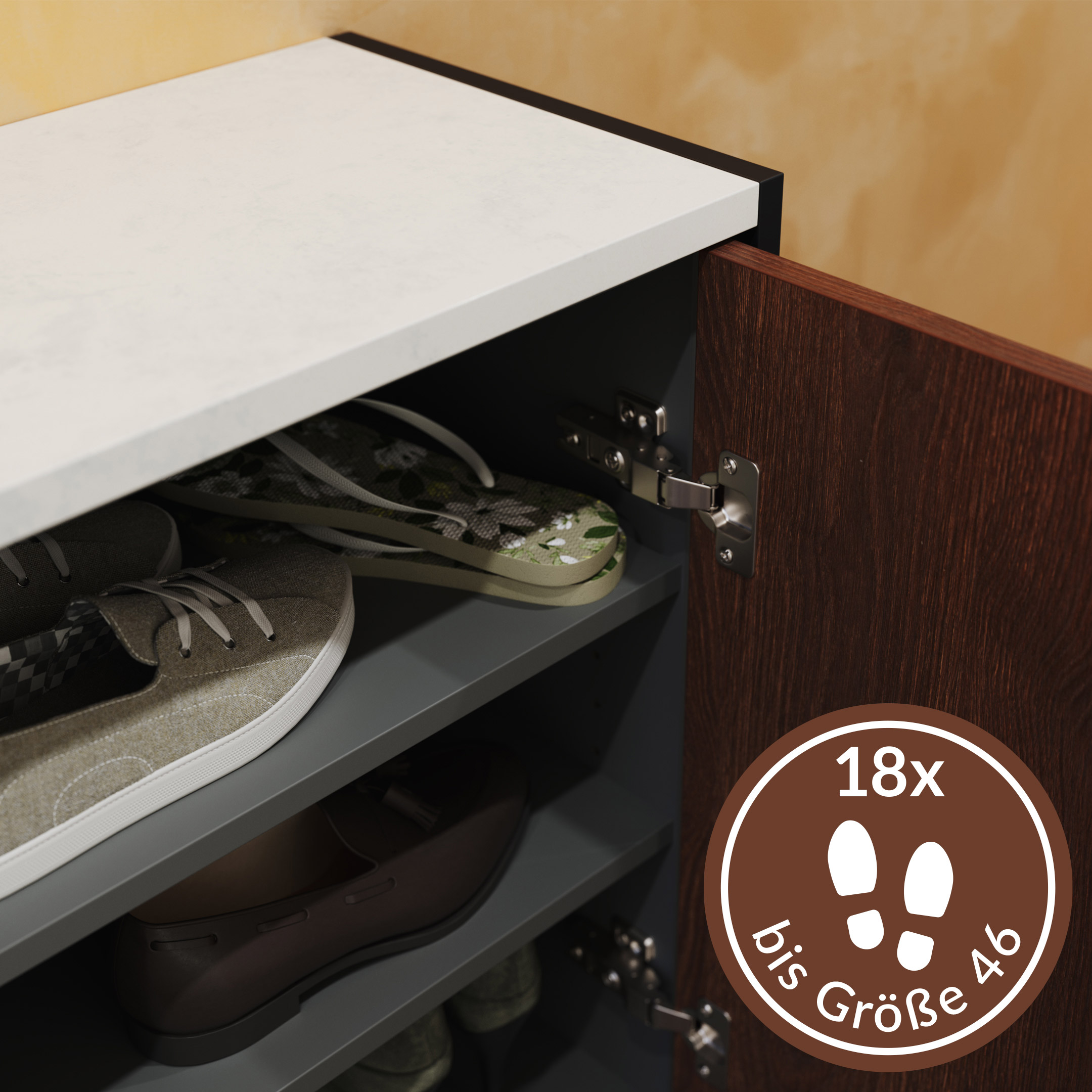 Schuhschrank Alba-XL mit 3 Türen für 18 Paar Schuhe Redwood inklusive edler Quarzstein-Ablagefläche