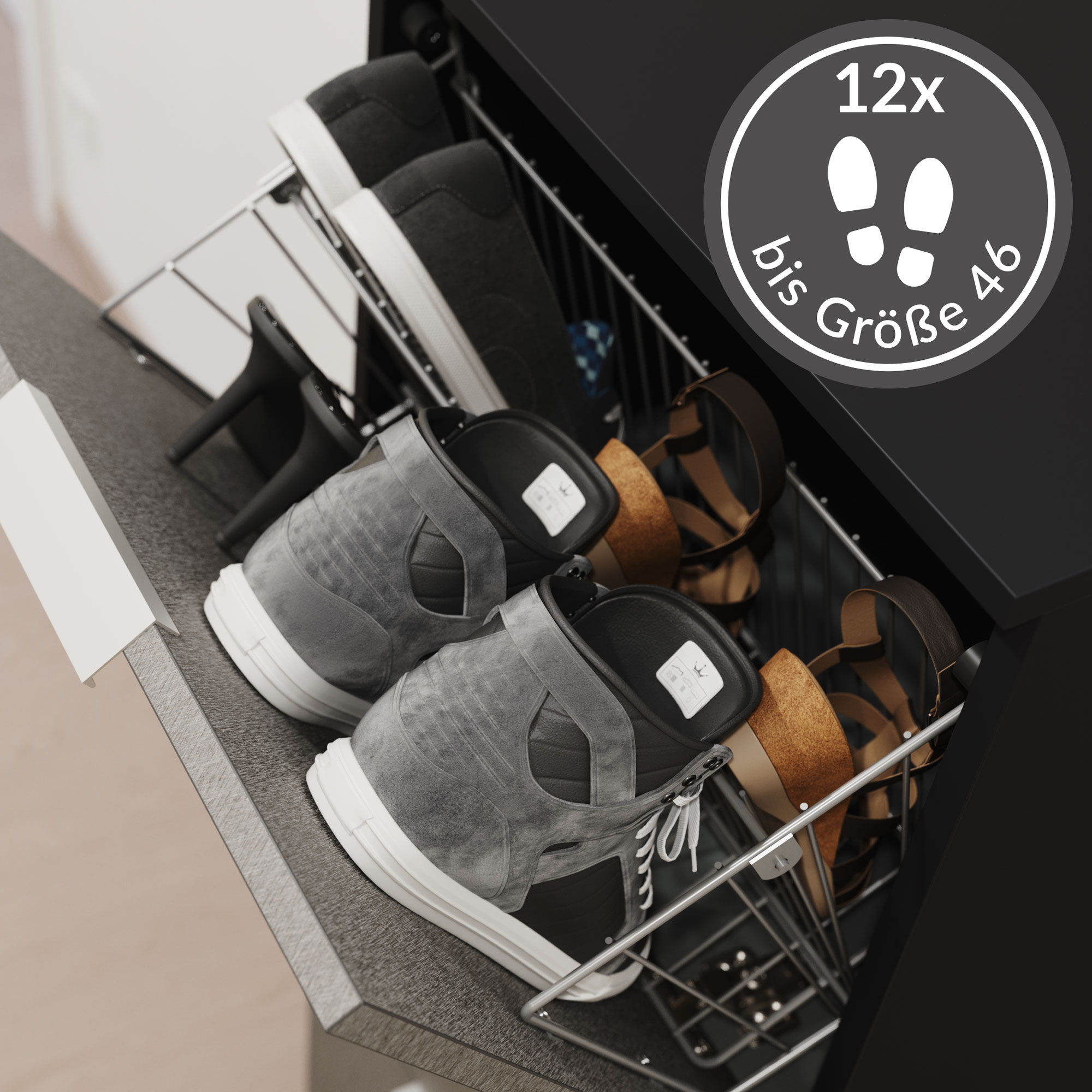 - Stabile und robuste Schuhkörbe aus Metall mit zwei großen Fächern. In jedes dieser beiden Fächer passen mindestens 2 Paar Schuhe der Größe 46 (Schuhlänge 39,5 cm).