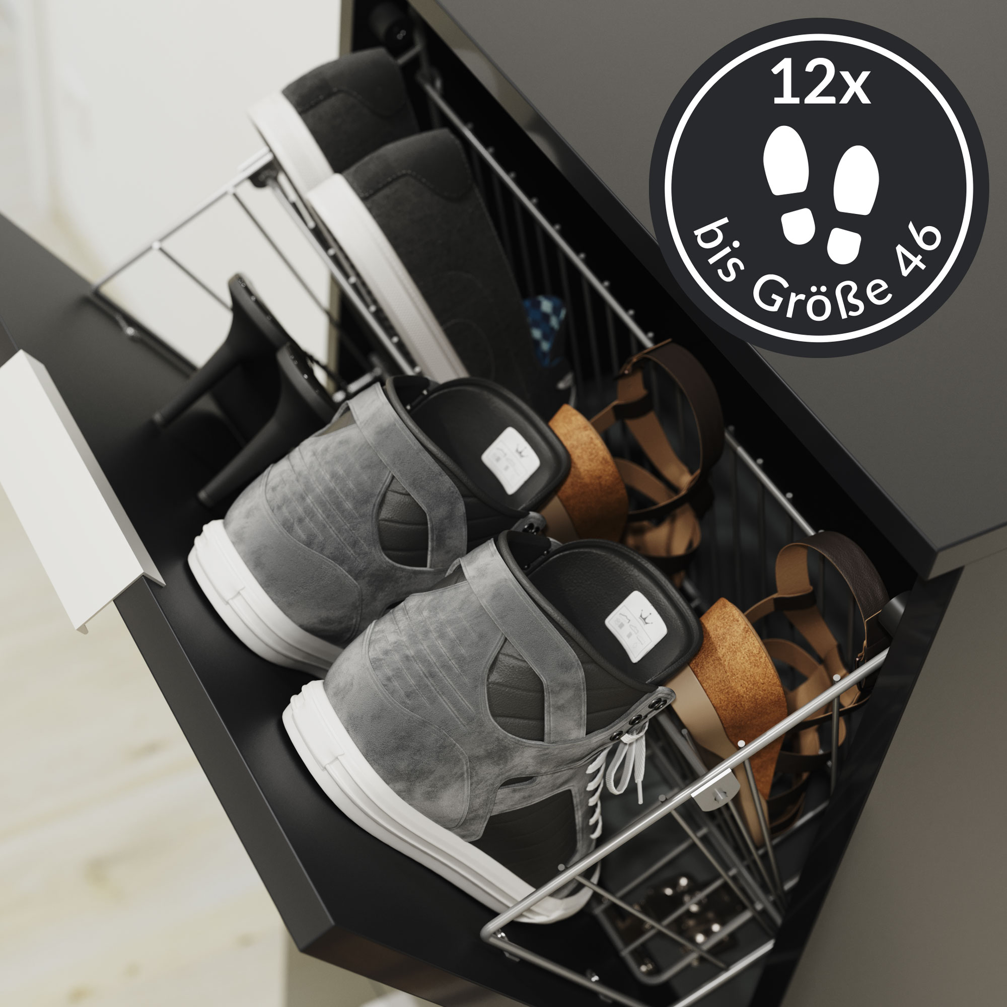 - Stabile und robuste Schuhkörbe aus Metall mit zwei großen Fächern. In jedes dieser beiden Fächer passen mindestens 2 Paar Schuhe der Größe 46 (Schuhlänge 39,5 cm).