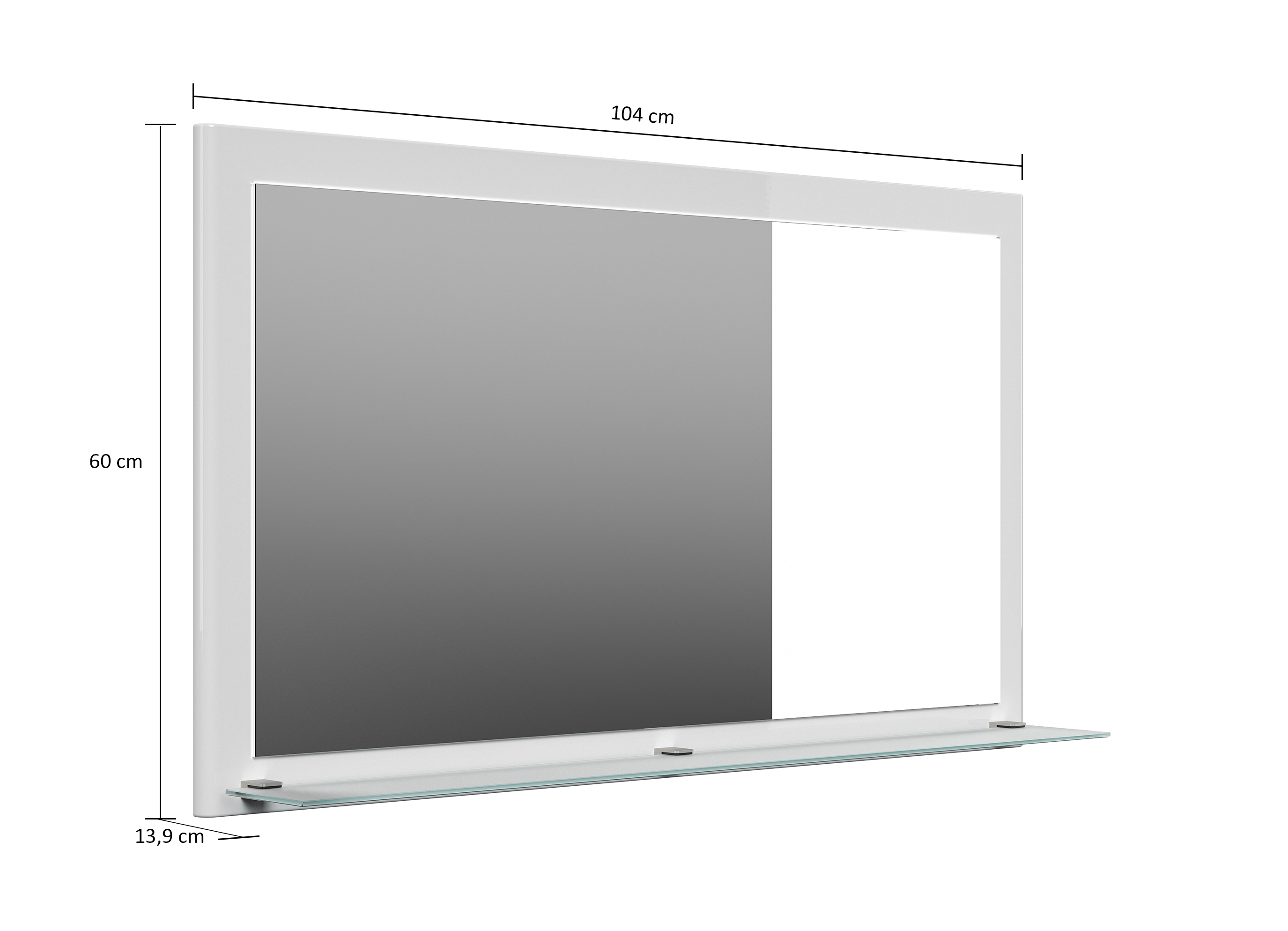 Spiegel quer (B/H/T) 104/60/13,9 cm mit 1 Glasablage (B/T) 100,8 x 12 cm.Herstellung und Materialien:
