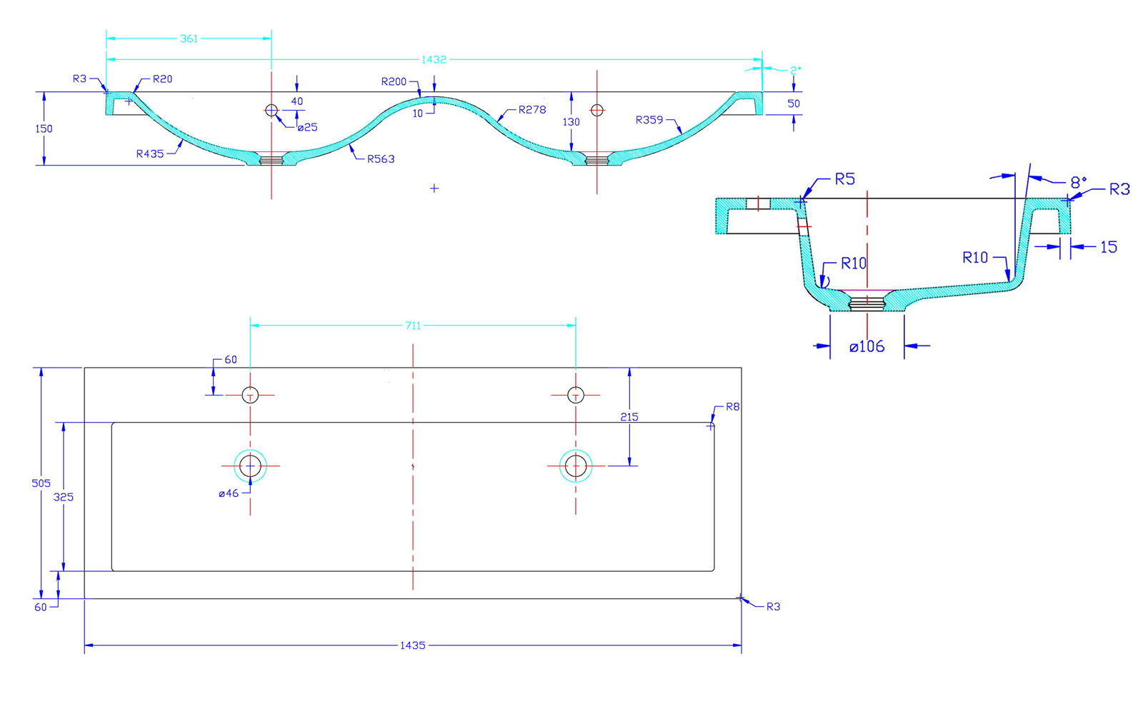 1 Mineralguss-Waschbecken mit 2 Waschplätzen in Design Wellenform (B/H/T) 143,5/6,8/5/50,5 cm.