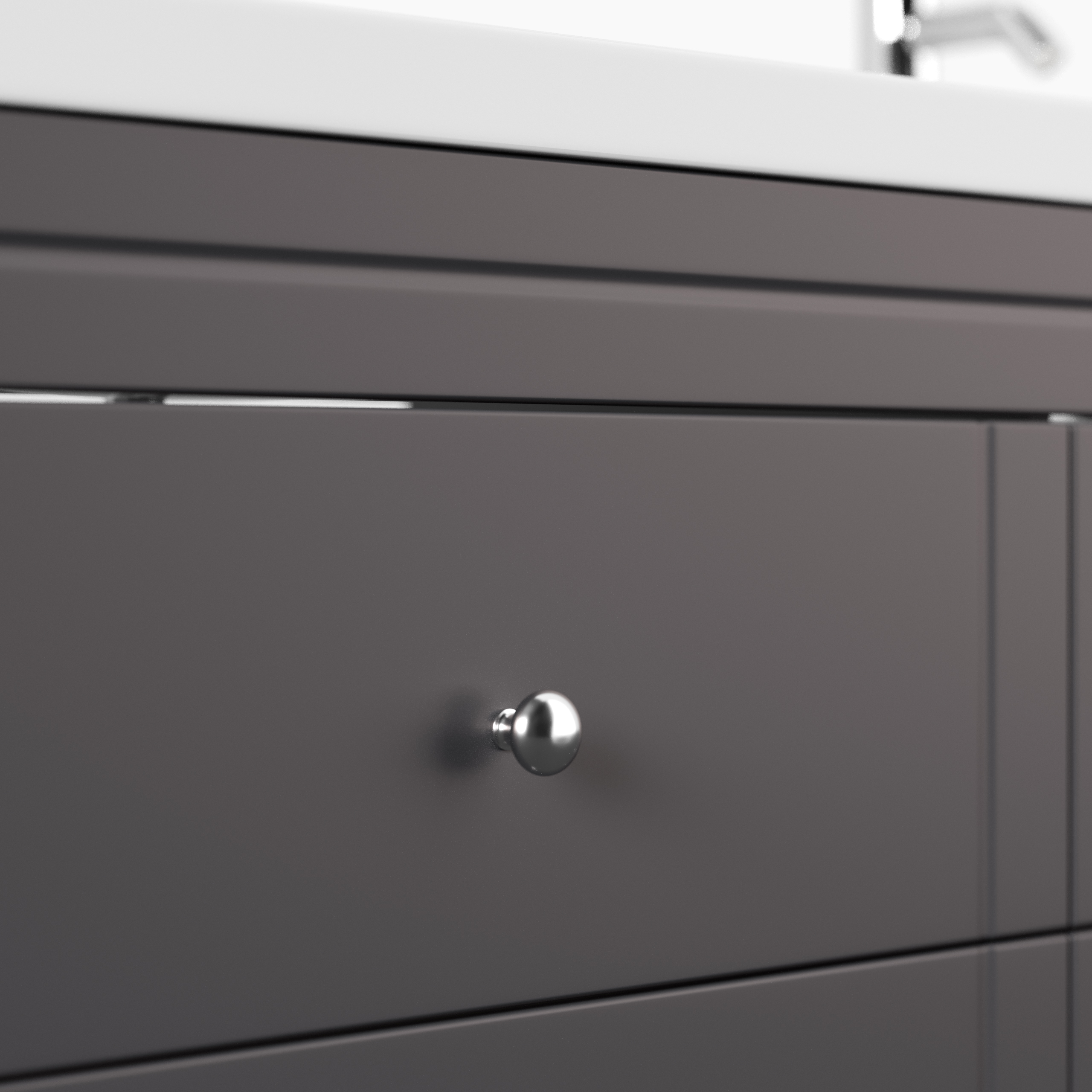 Die Fronten sind mit dekorativen Einfräsungen im Landhausstil ausgestattet. Die Knopfgriffe sind aus Metall verchromt und poliert.