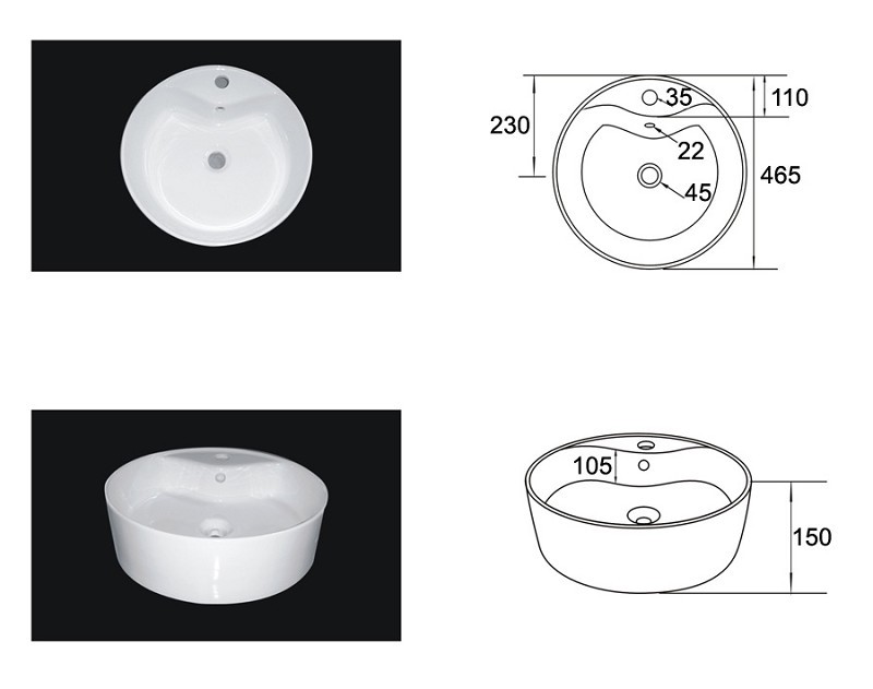 Waschbecken Durchmesser 46,5 cm, Höhe 15 cm.