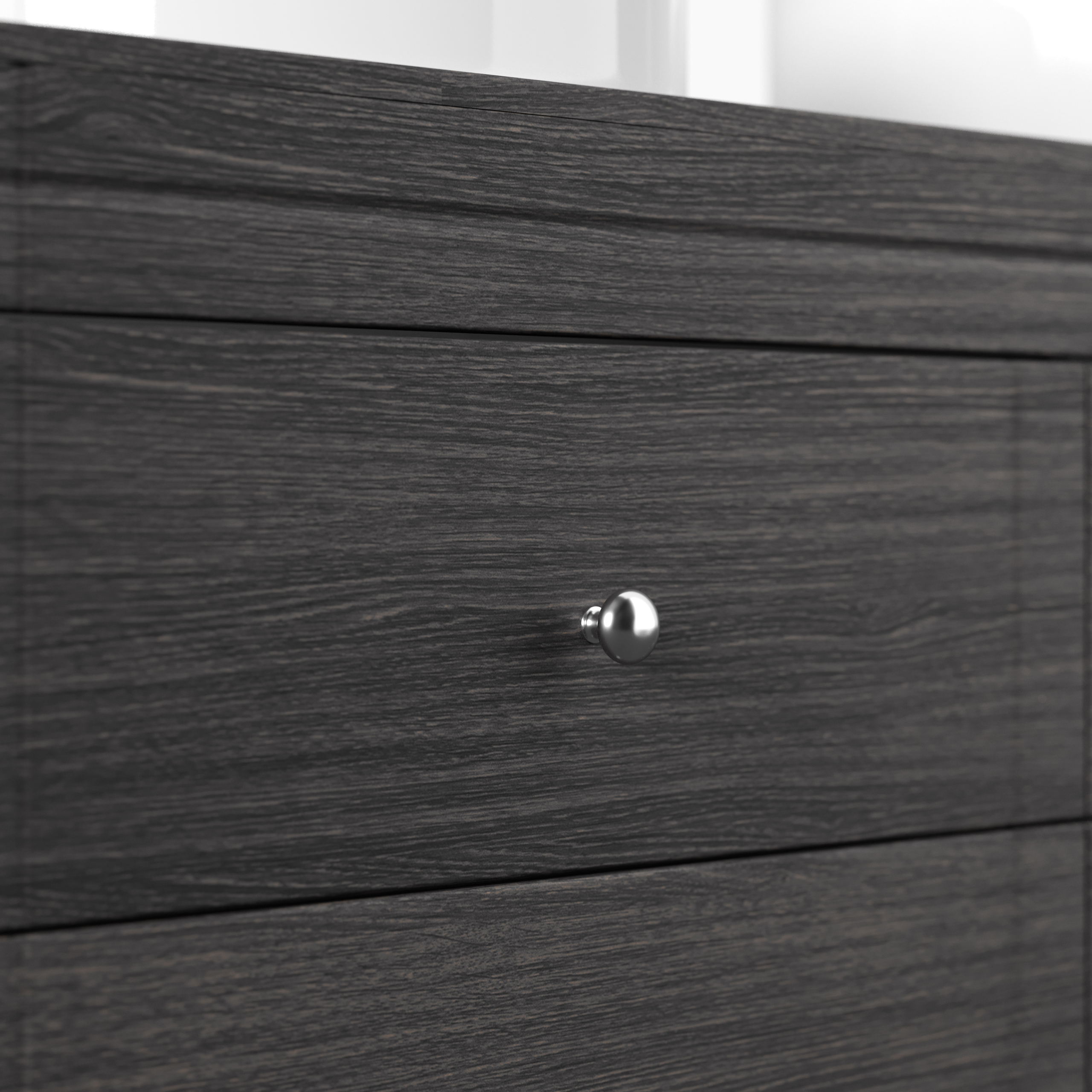 Die Fronten sind mit dekorativen Einfräsungen im Landhausstil ausgestattet. Die Knopfgriffe sind aus Metall verchromt und poliert.