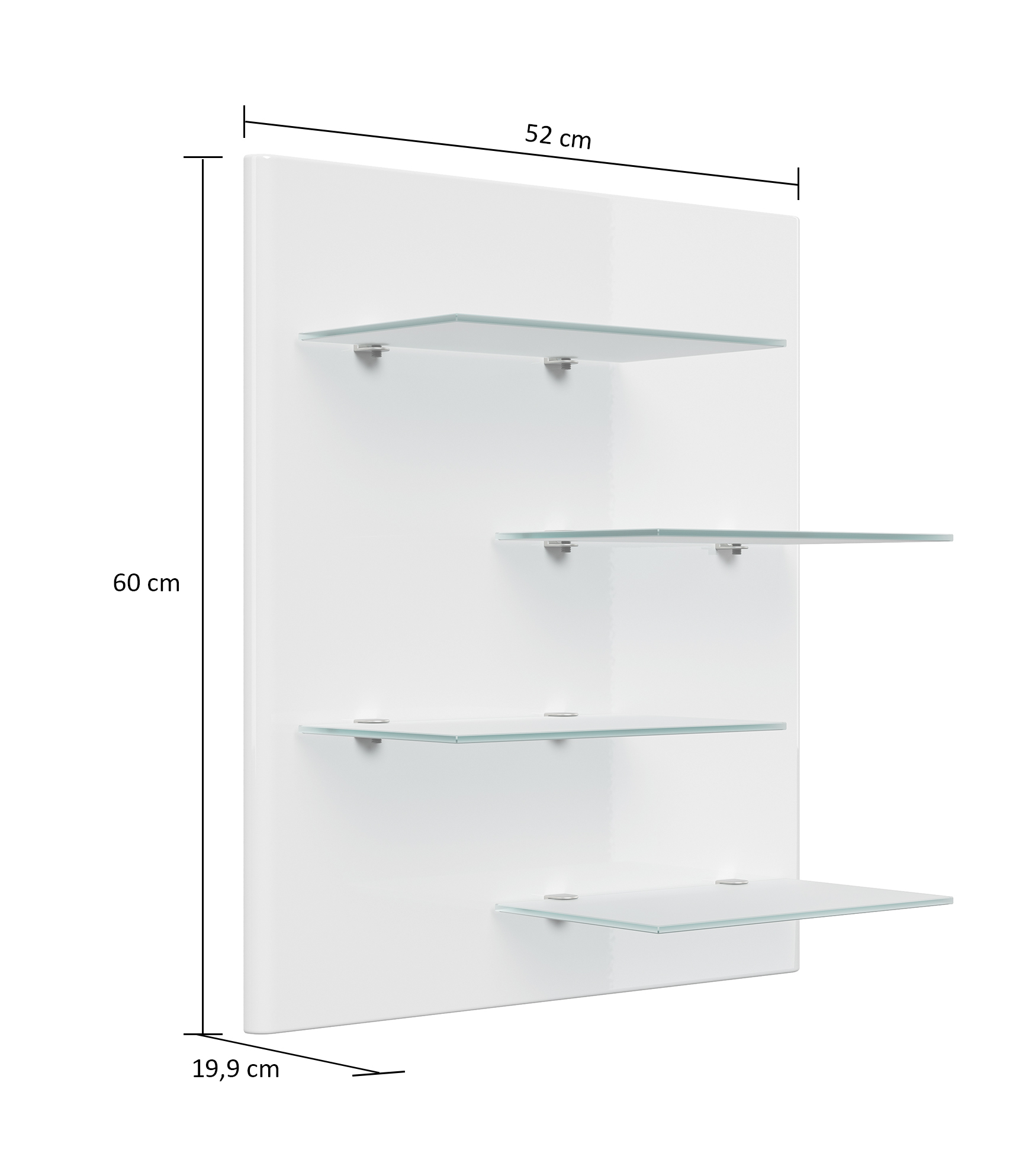 Wandregal Panel schmal (B/H/T) 52/60/19,9 cm mit 4 Glasablagen (B/T) 29/18 cm.Herstellung und Materialien: