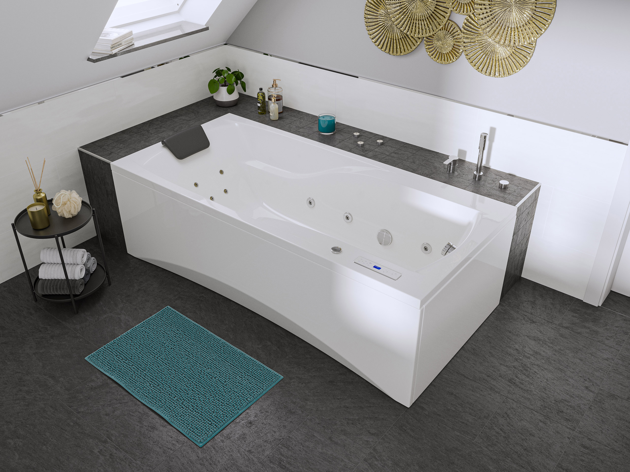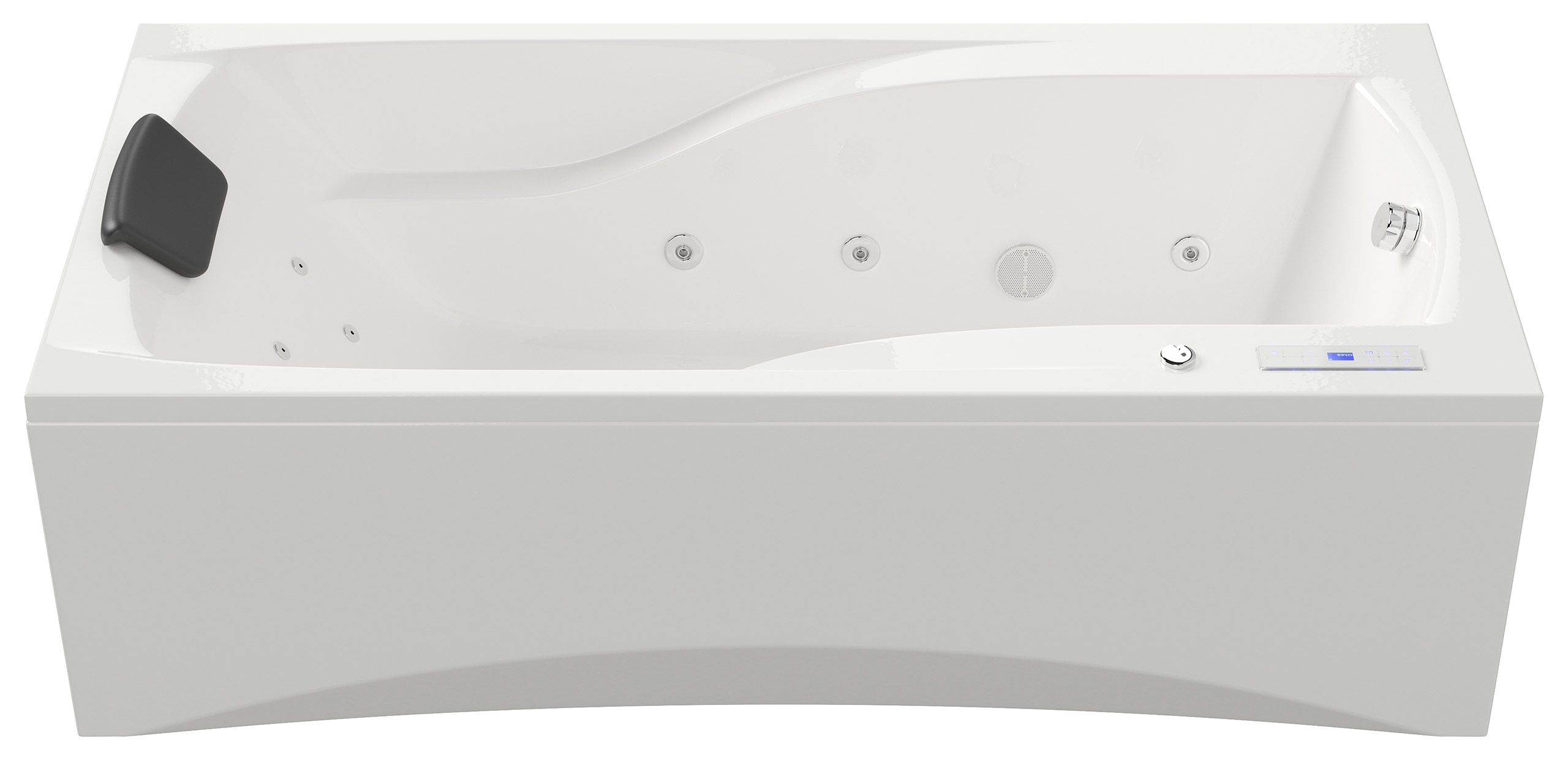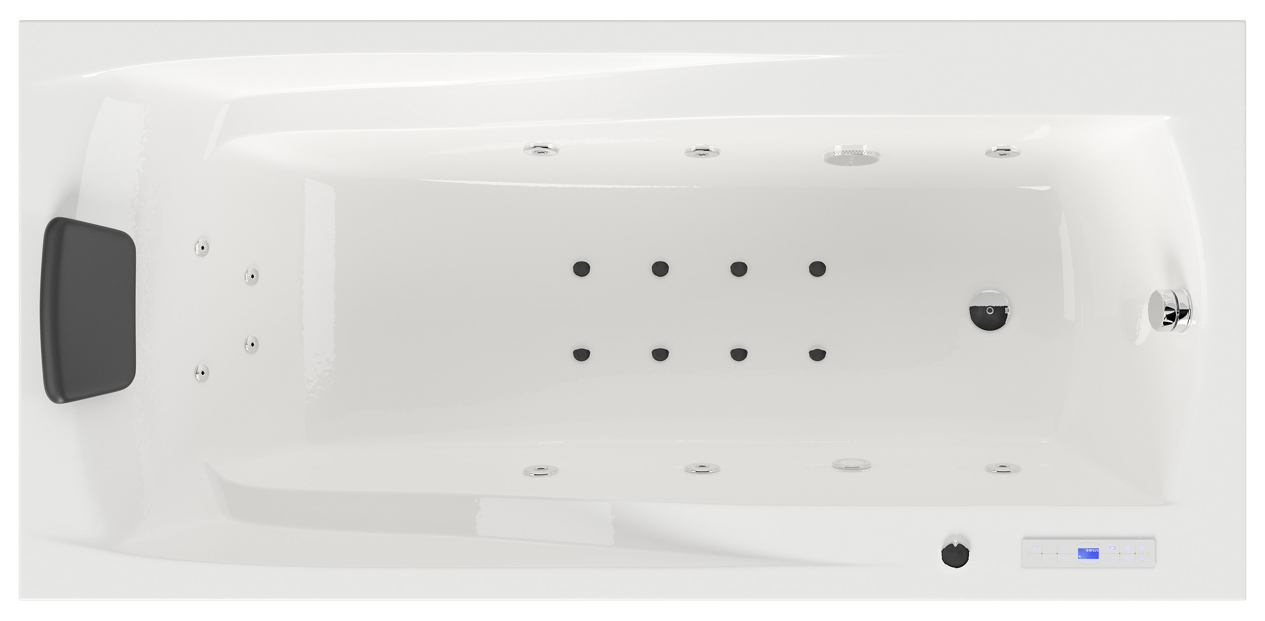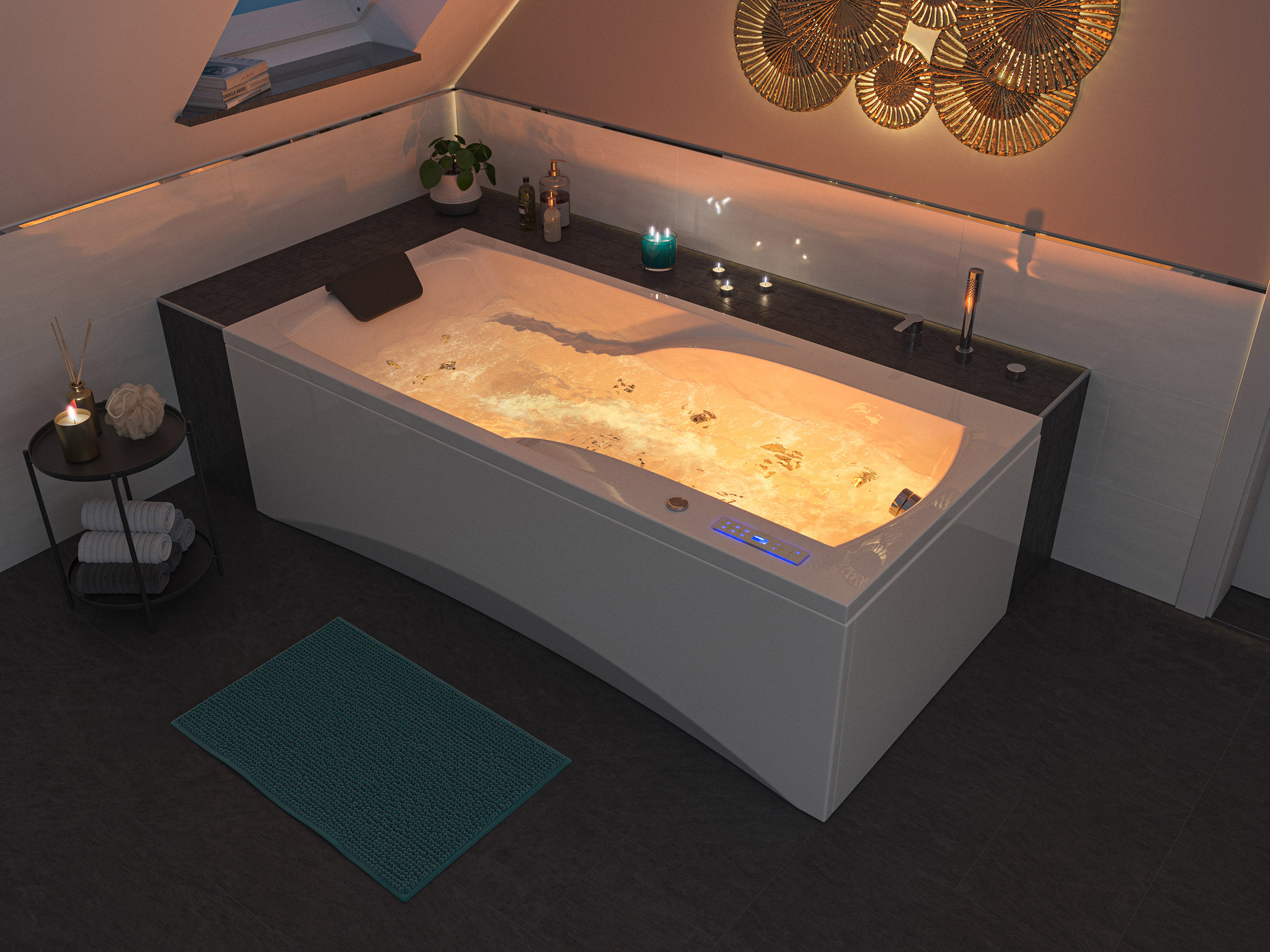Vorteile: Dezente Strahler seitlich. Automatischer Farbwechsel mit gleichmäßiger Wasserbeleuchtung. Intensive Farben leuchten unter Wasser. Entspanntes Baden mit Chromotherapie.Massagefunktion: Düsen-Ausstattung