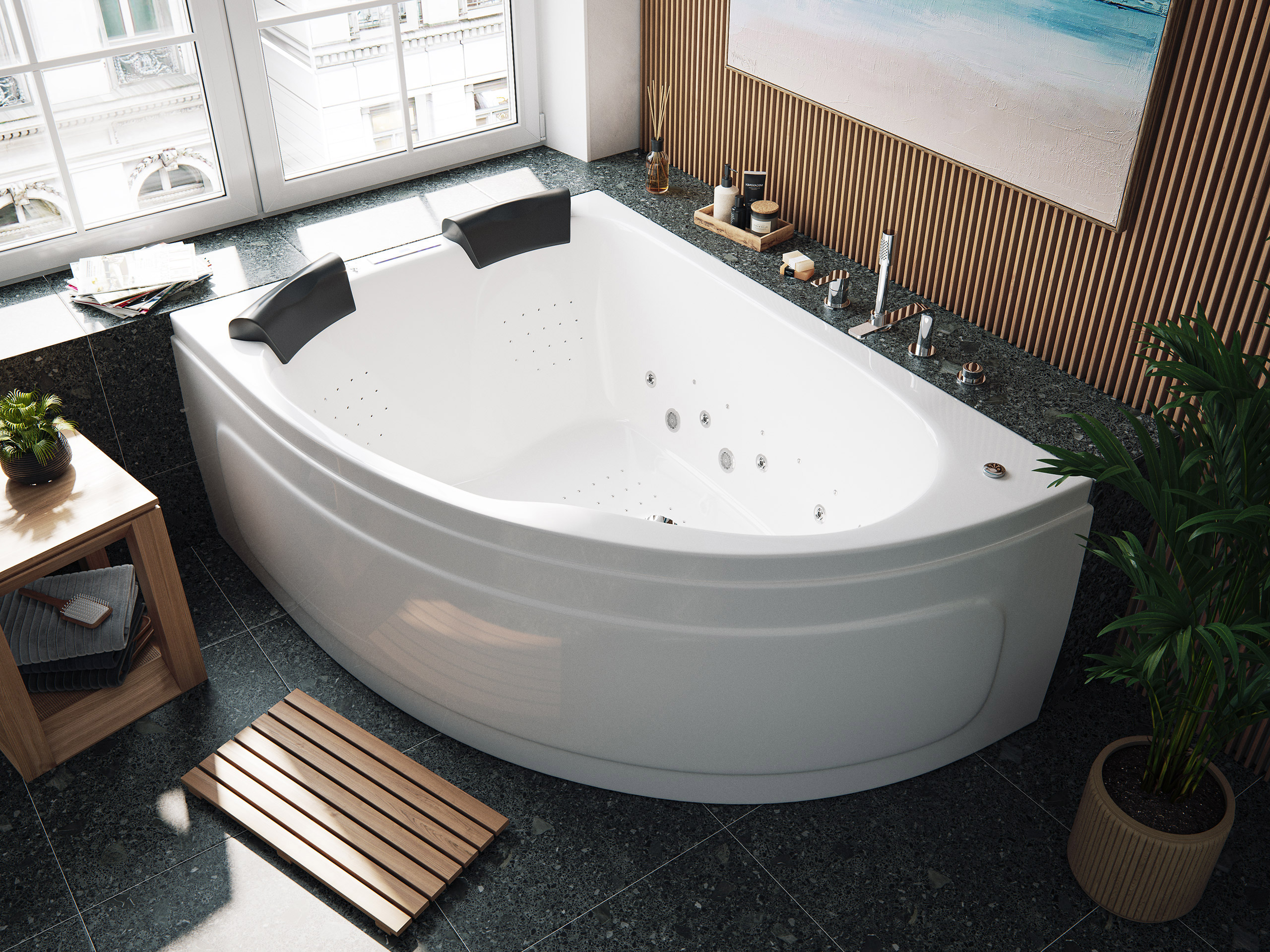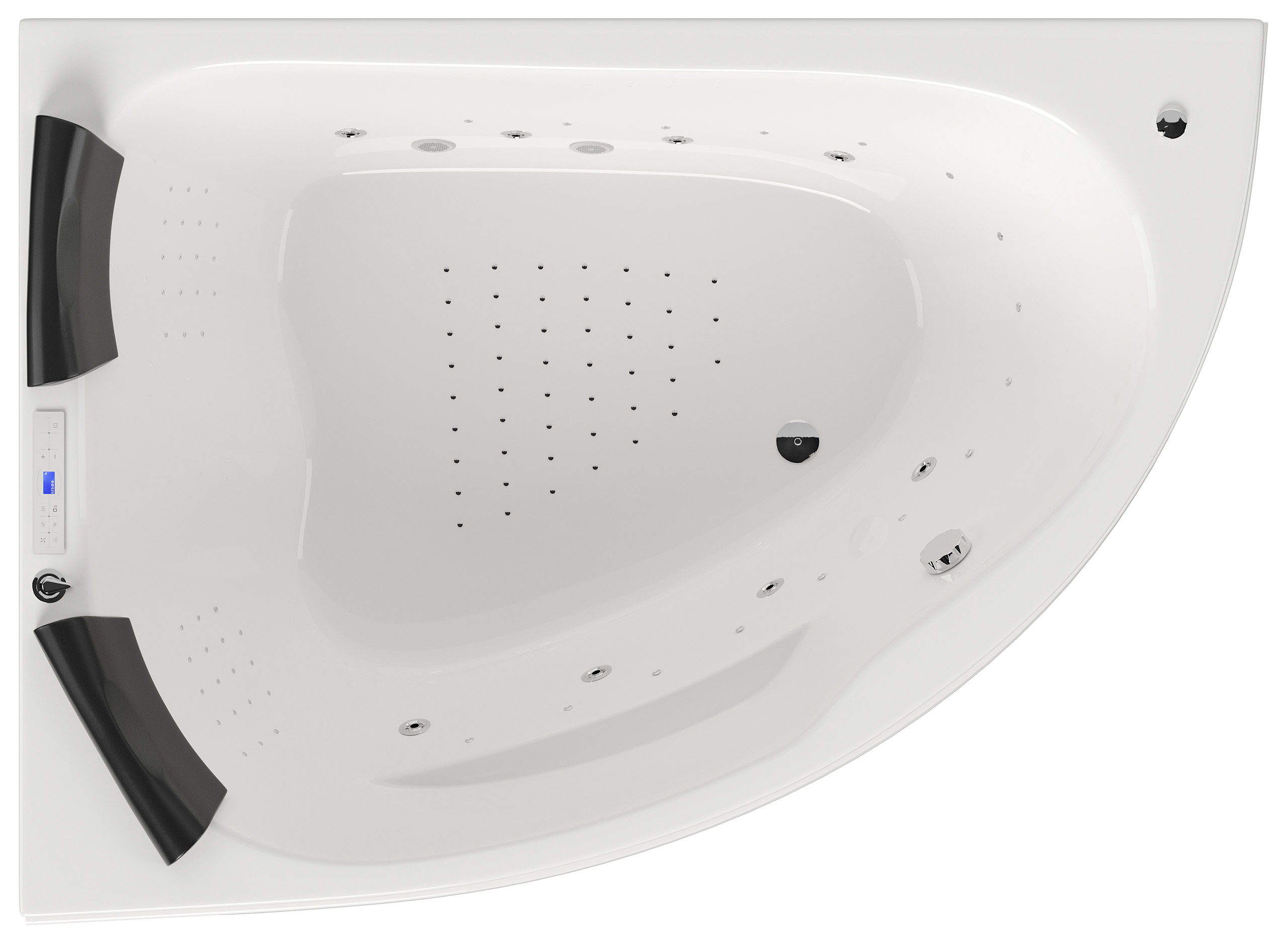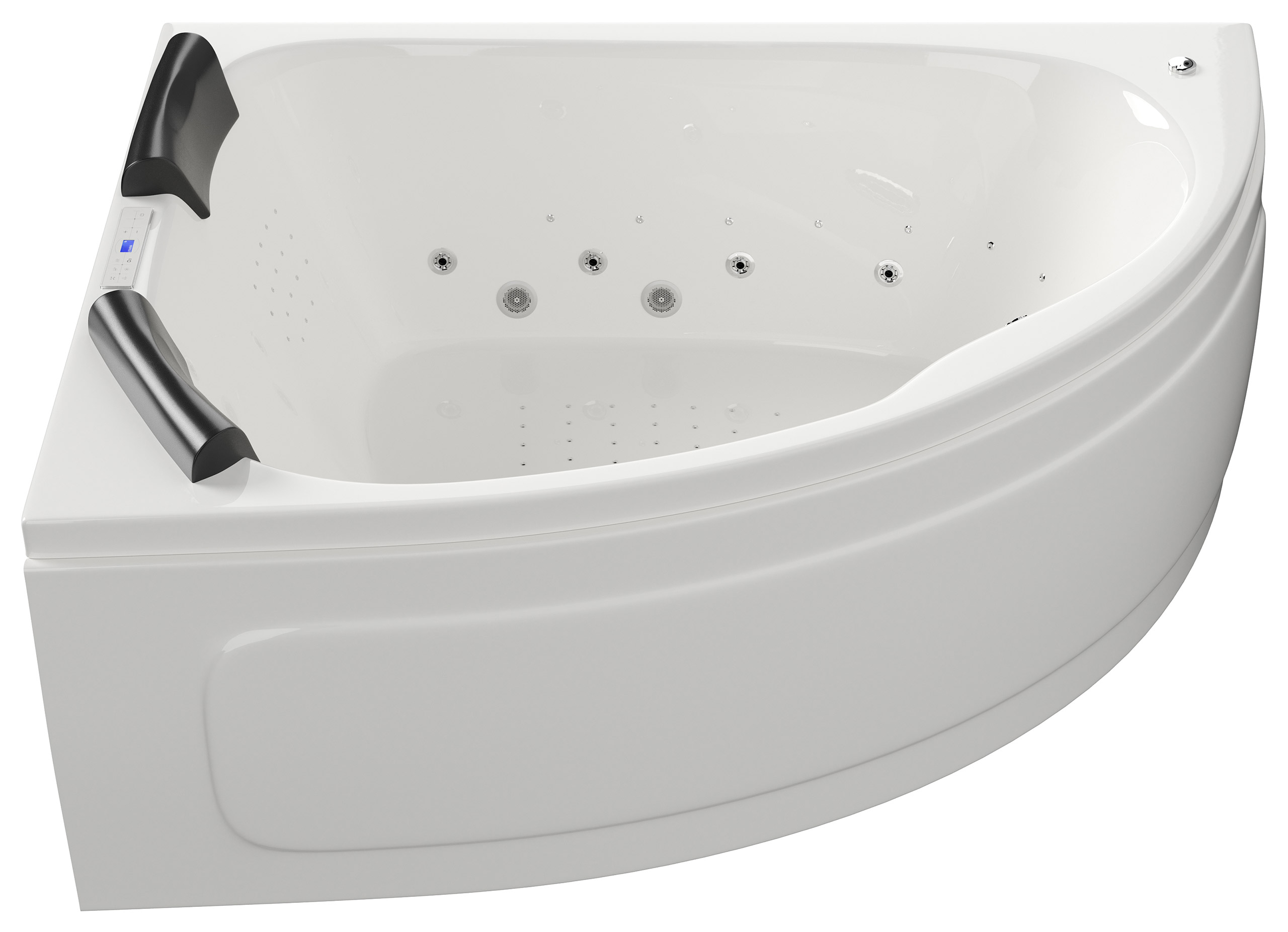 2x4 Stk. Seiten-Massagedüsen Hydrojets Hydromassage, 2x18 Stk. Nano-Massagedüsen Hydrojets Hydromassage, 45 Stk. Bodenluftdüsen Aerojets für prickelnden Sprudel-Effekt Whirlpool.Material: Wanne aus Sanitäracryl auf stabilem Rahmen mit höhenverstellbaren Füßen.